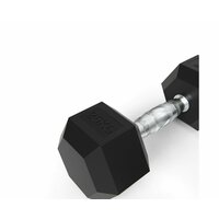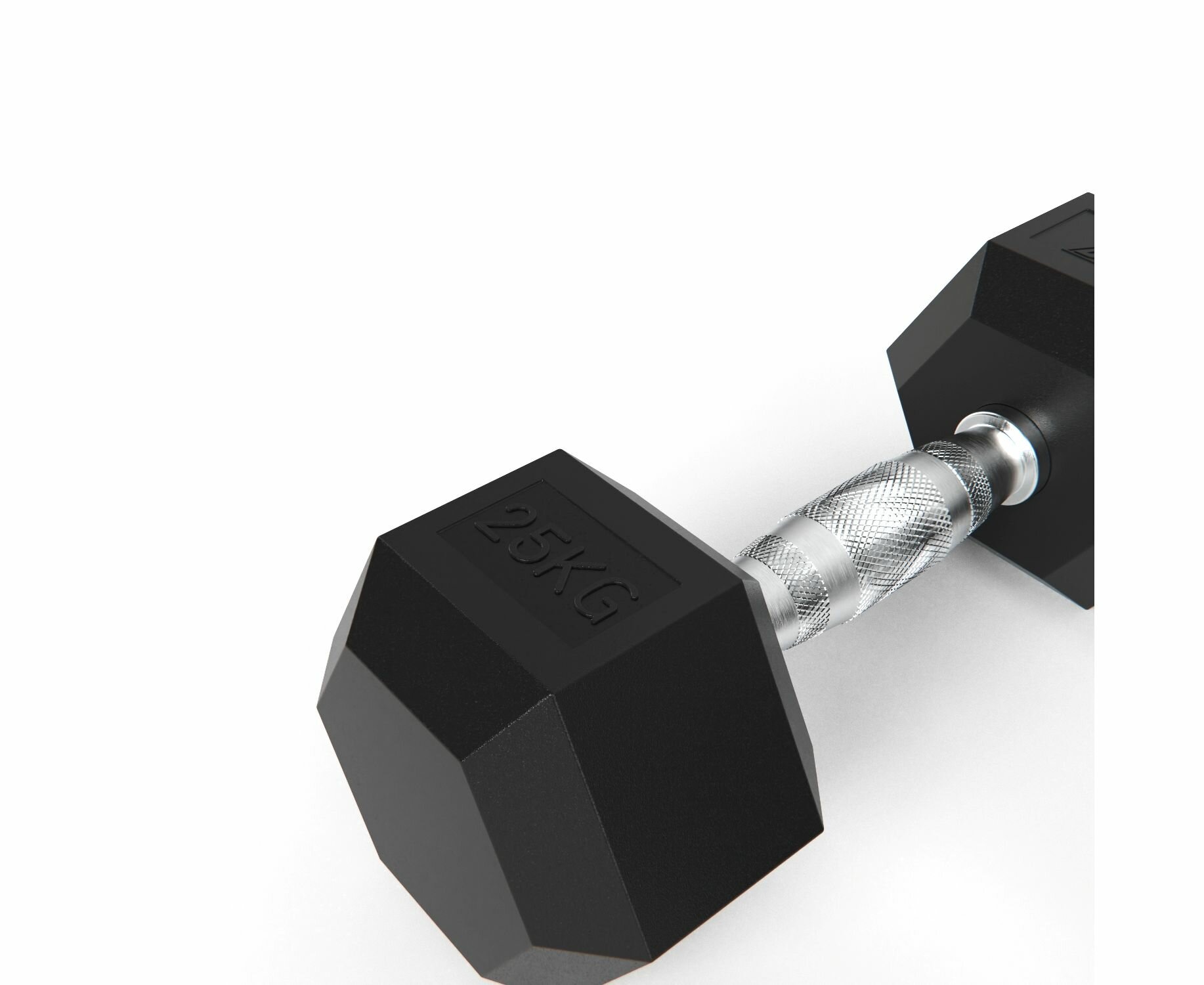 Гантель обрезиненная с хромированной ручкой. Вес гантели 25 кг, в комплекте 2 штуки (пара). Ручка с насечками для предотвращения скольжения. Гексагональная гантель – обрезиненная модель удобной конструкции. Гантель имеет много граней и не катается по полу. Обрезиненная поверхность не царапает пол при ударе.