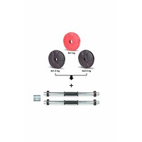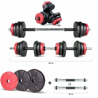 В состав входят: 4 блина по 2,5 кг, 4 блина по 1,5 кг, 4 блина по 1 кг, 2 хромированных грифа по 50 см, 4 специальных зажима, 1 соединительный механизм для грифов