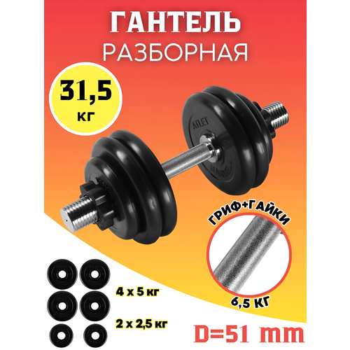 Данная разборная гантель весом 31.5 кг с обрезиненными блинами лучший вариант для профессионального использования. Благодаря своему большому весу и удобной конструкции подходит для прорабатывания мышц и эффективного выполнения базовых и других упражнений. Спортсмен может без труда разобрать гантель, если возникает необходимость изменить нагрузку. Диски прорезинены высококачественным материалом, который не имеет запаха. Он отлично защищает поверхности при падении диска, а также исключает дребезжание во время тренировок. Состав: 2 диска по 2.5кг ,4 диска по 5кг ,1 гриф с гайками 6.5кг