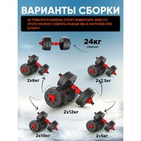 Две разборные гантели 12 кг российского бренда Гантели-в-Деле с возможностью трансформации в штангу — это универсальное спортивное оборудование, идеально подходящее для домашних тренировок. Каждая гантель весит 12 кг, легко регулируется по весу, блины надежно фиксируются на штанге гайками.
