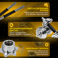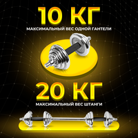 Гантели разборные легко и просто трансформируются в штангу легко. В набор для спорта входит гриф для штанги, на который можно нанизывать блины от гантелей. Также гантели можно применять для набора массы тела, накачивания мышц, сушки, как самостоятельный спортивный снаряд. Удобная гантель плотно держится в руке, а благодаря возможности трансформирования, можно существенно расширить свой спортивный инвентарь и заниматься тяжелой атлетикой полноценно. Все блины, грифы и другие аксессуары помещаются в чемоданчик, который удобно брать в поездку или на улицу. Настоящий мужской набор – отличная идея для подарка на любой праздник: день рождения, юбилей, просто так без повода. Вес изделия 20кг. Материал: хромированная сталь