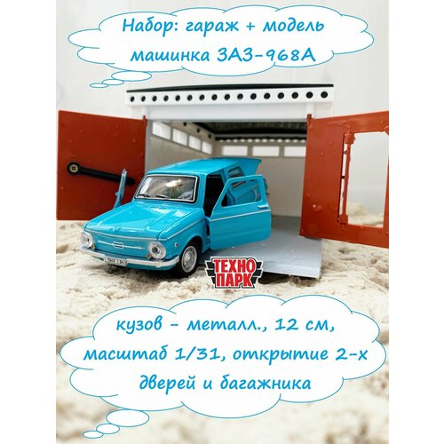Набор - игрушечный разборный гараж с распашными воротами и металлическая инерционная ретро машинка СССР Запорожец ЗАЗ-968А с открывающимися дверями и багажником.