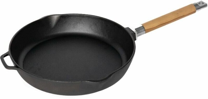 Сковорода Гардарика чугунная, глуб, съемная ручка, 26см. Надежная система крепления деревянной ручки позволяет использовать и без того тяжелую чугунную посуду не опасаясь, что ручка подведет в самый не подходящий момент. Кроме того, при условии снятой ручки посуду можно использовать в духовом шкафу или просто компактно ее хранить. В чугунных сковородах Гардарика ручка снимается путем раскручивания зажимного элемента встроенного в саму ручку. Такая Фиксация наиболее надежная, но она не самая удобная в плане присоединения и снятия ручки. Процесс занимает длительное время по сравнению с другими креплениями и может быть выполнен только при помощи двух рук с холодной сковородой. Посуду можно использовать в духовке. Материал посуды - чугун.