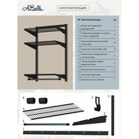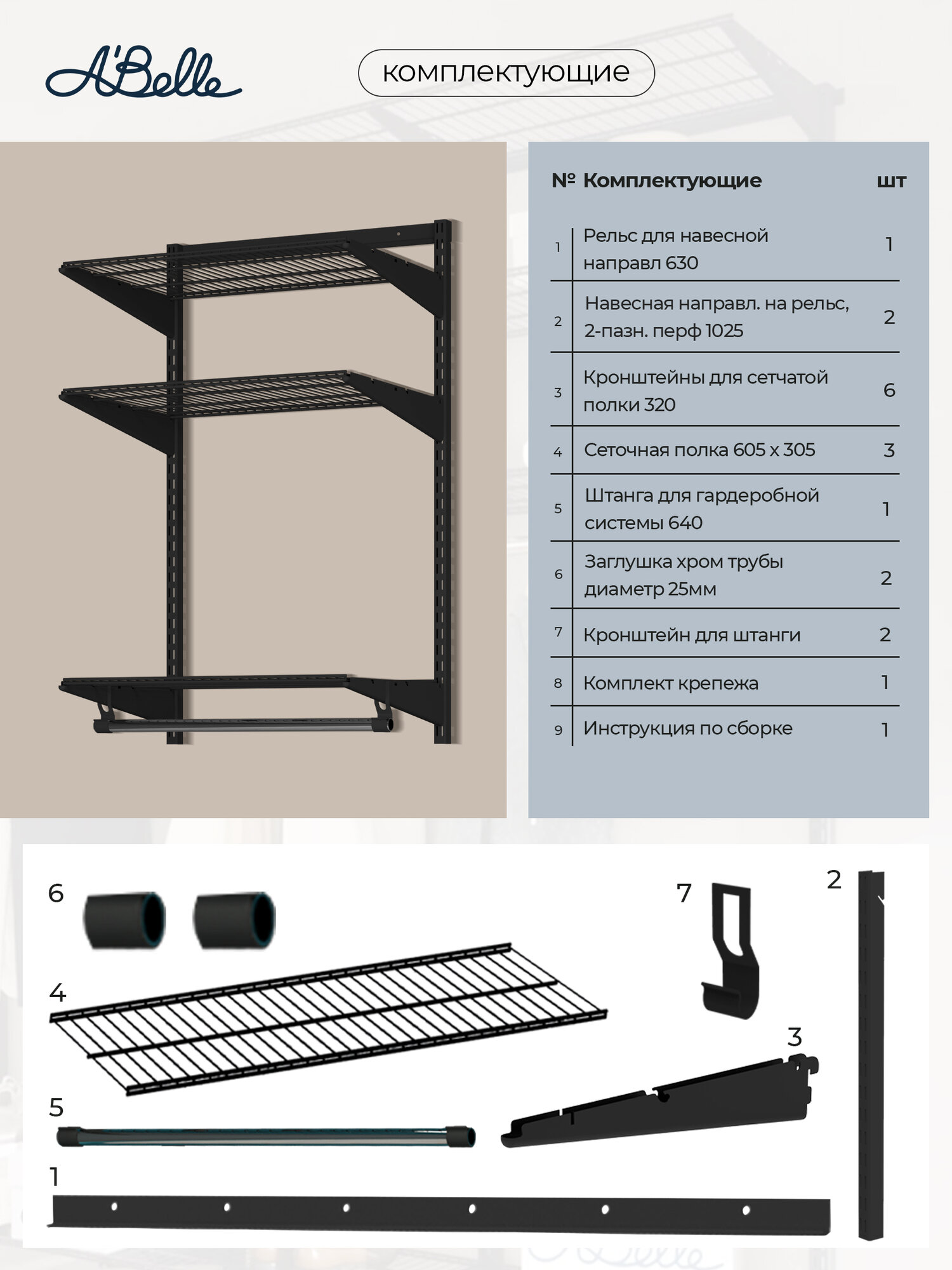 | Подробная комплектация | Рельс для навесной направляющей 630 мм 2шт. Навесная направляющая 1025 мм 3шт. Кронштейн 320 мм 9шт. Сеточная полка 605 х 305 мм 6шт. Штанга 640 мм (хром) 2шт. Заглушка хром трубы диаметр 25мм 2шт. Соединитель хром трубы диаметр 25мм 1шт. Кронштейн для штанги 3шт. Комплект крепежа 1шт. Инструкция по сборке 1шт. |