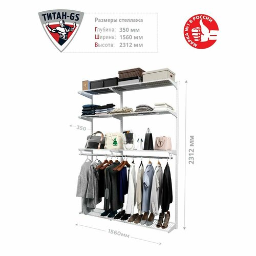 Габариты 1500х350х2300 мм позволяют удобно разместить все необходимые вещи, а продуманное расположение полок и секций делает использование системы максимально комфортным. Гардеробная система Титан-GS подходит как для больших, так и для небольших помещений. Она позволяет эффективно организовать пространство, обеспечивая легкий доступ ко всем предметам гардероба.