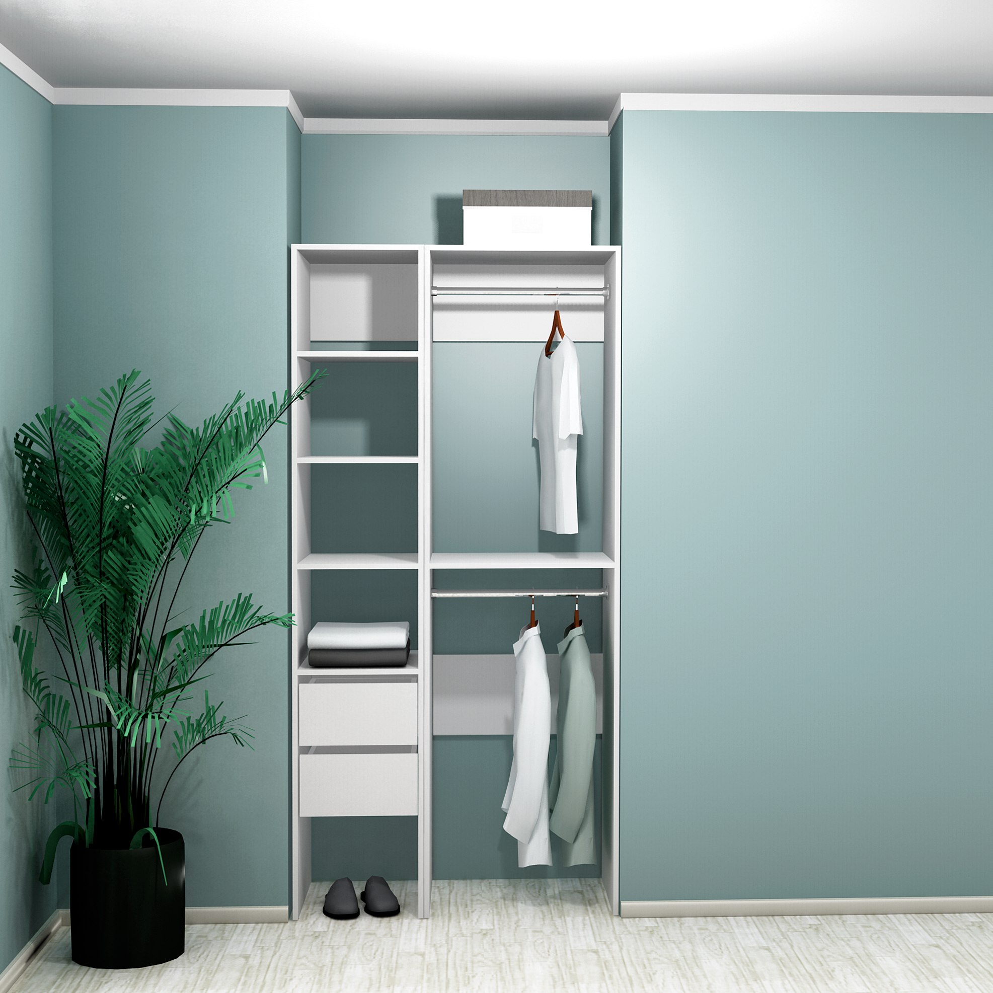 В комплект входят модули: Гардеробная система Стеллаж Модус М0201 40х50х208,4 см С полками С ящиками Белый Гардеробная система Стеллаж Модус М0203 60х50х208,4 см Вешалка С полками Белый