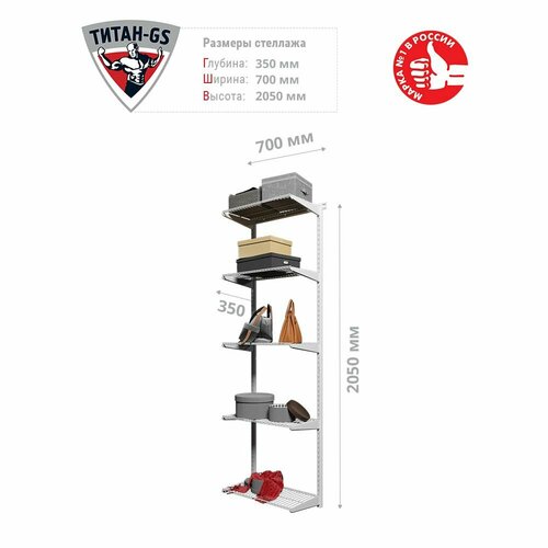 | Комплектация | Несущий рельс 1260 мм – 1 шт, Кронштейн для полки 335 мм – 10 шт, Сеточная полка 1203x306 мм – 5 шт, Стойка 1025 мм – 4 шт, Комплект крепежа – 1 шт |