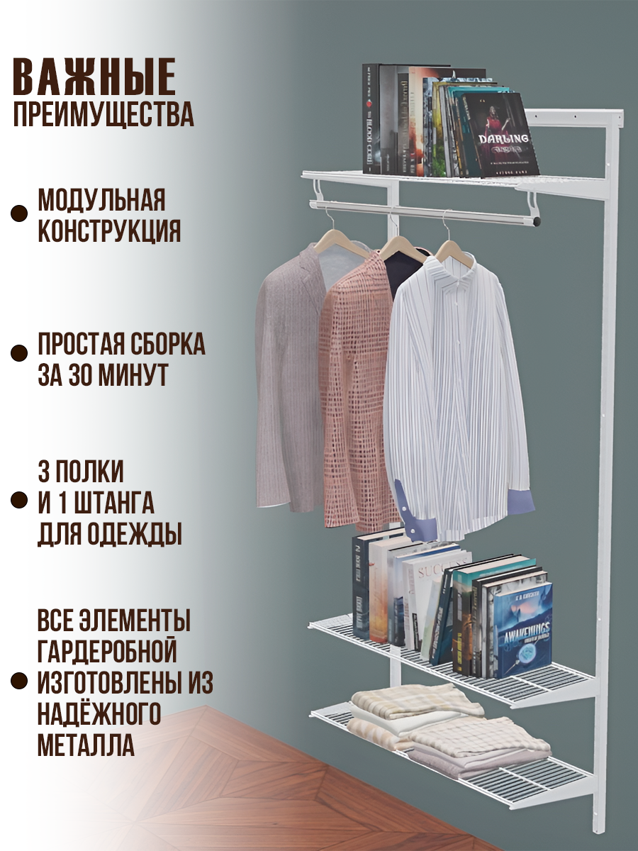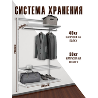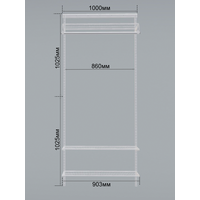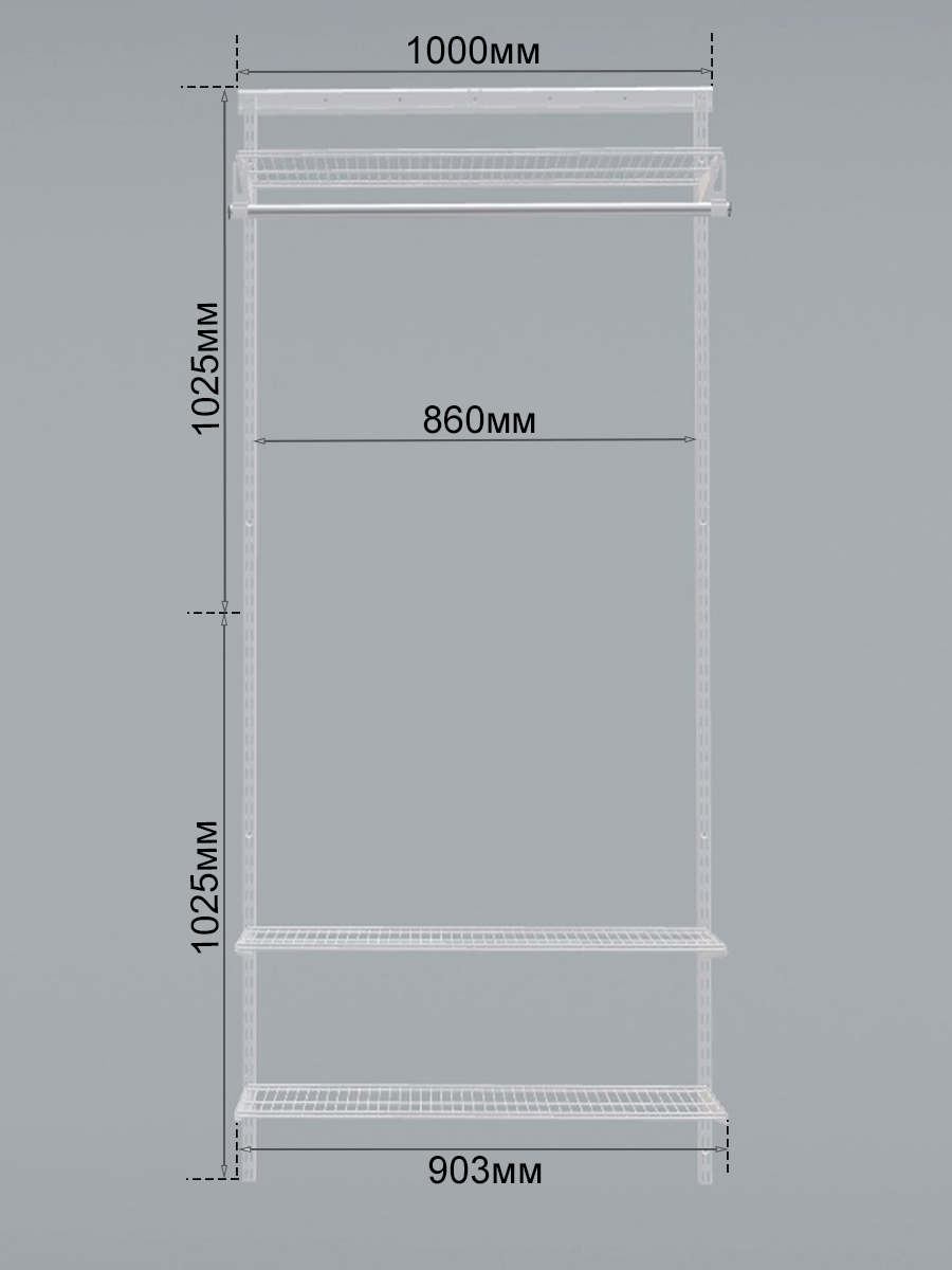 • рельс для крепления стоек 1000 мм - 1 шт • стойка для установки кронштейнов 1025 мм - 4 шт • кронштейн для размещения сеточных полок 335 мм - 6 шт • кронштейн для перекладины - 2 шт • сетчатая полка 306х903 мм - 3 шт • перекладина для вешалок 940 мм - 1 шт • комплект торцевых заглушек для перекладины - 1 шт