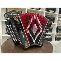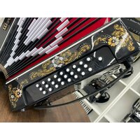 Гармонь «Шуйская» - 25х25-III – трехголосовый язычковый музыкальный инструмент, звукоряд которого основан на неполной хроматической гамме. Звуковой диапазон мелодии от ноты «ля» малой октавы до «ля» третьей октавы. Строй гармони выполняется в тональности– ЛЯ мажор = ФА диез минор, настройка - в розлив. Данная модель инструмента выпускается в двух вариантах:• без регистра – арт. S 51 XL• с регистром – арт. S 32 XL Регистр имеет два положения:• верхнее: инструмент звучит в три голоса• нижнее: инструмент звучит в два голоса. Голосовые планки - алюминиевые кусковые улучшенного качества, доведенные до высокого класса звучания за счет ручной доработки. Голоса стальные: облегчены, выправлены подъемы, зазоры минимальны. Настройка - в розлив (аккордеонное звучание). Сочетание голосов: основной, розлив, баритон. Клавиатуры: правая– двухрядная, пуговичная (25 клавиш). левая– трехрядная, кнопочная улучшенная (25 кнопок). Резонаторы изготовлены из лиственных и хвойных пород древесины и имеют лаковое покрытие. Корпус гармони изготовлен из березовой клеевой фанеры и облицован целлулоидом, все поверхности которого отполированы и имеет овальную форму. Передние и верхние стенки корпуса украшены художественным орнаментом-росписью, выполненной в традиционном стиле палехской миниатюры. Роспись может быть инкрустирована ювелирными камнями. Правая и левая сетки изготовлены из алюминиевых листов и покрыты черной нитроэмалью. Меховая камера изготовлена из картона, оклеена х/б тканью, имеет 16 рабочих борин, Меховые углы - латунь.