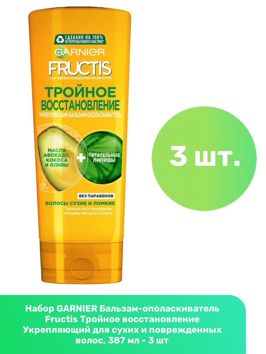 GARNIER Бальзам-ополаскиватель Fructis Тройное восстановление Укрепляющий для сухих и поврежденных волос, 387 мл — 3 шт: сравнение цен, характеристики, фото, актуальное наличие и цены.
