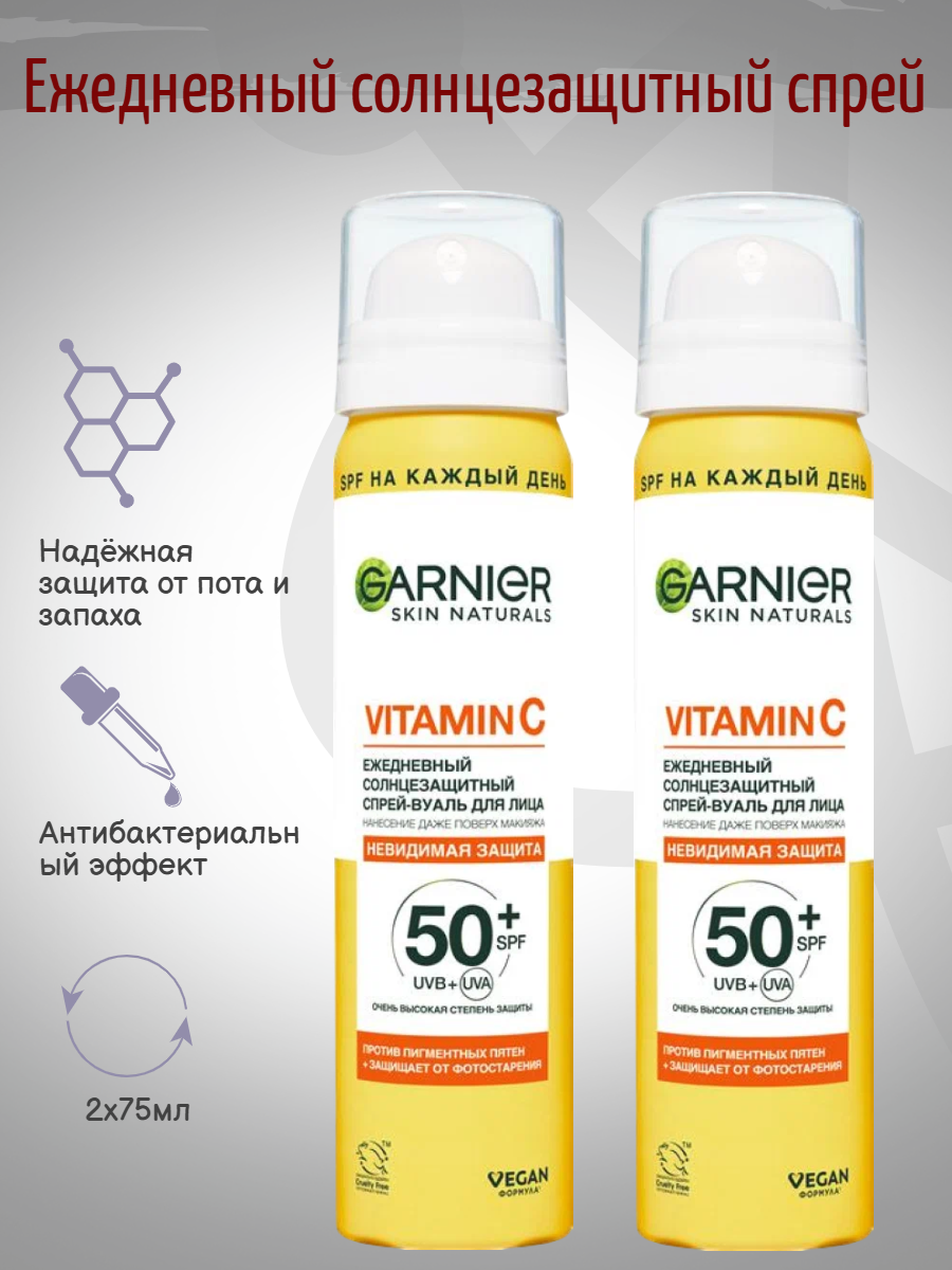 Купить GARNIER Ежедневный солнцезащитный спрей-вуаль для лица SPF 50+, 75 мл 2шт с доставкой по всей России. GARNIER Ежедневный солнцезащитный спрей-вуаль для лица SPF 50+, 75 мл 2шт: сравнение цен, характеристики, фото, актуальное наличие и цены.