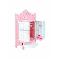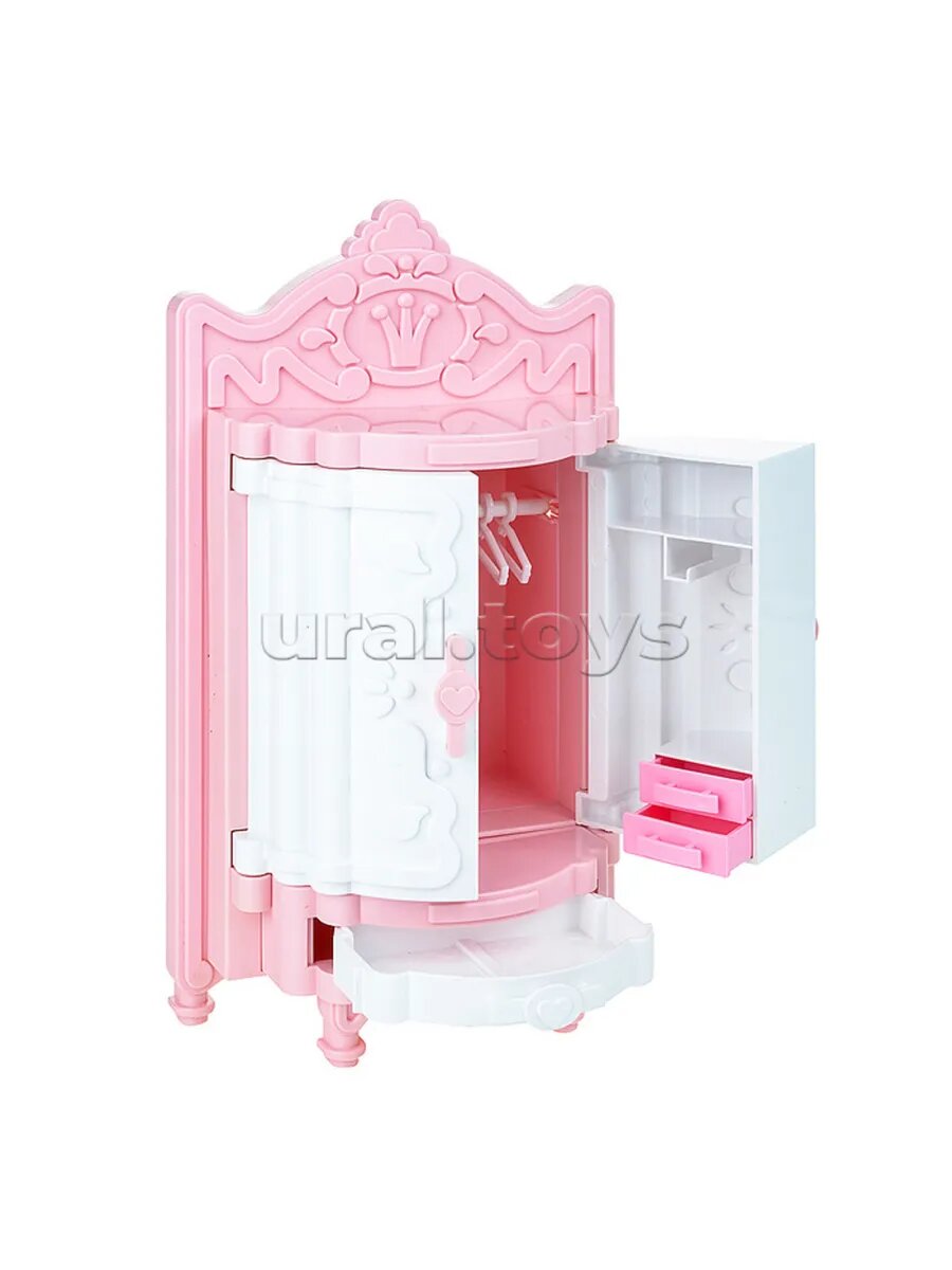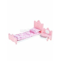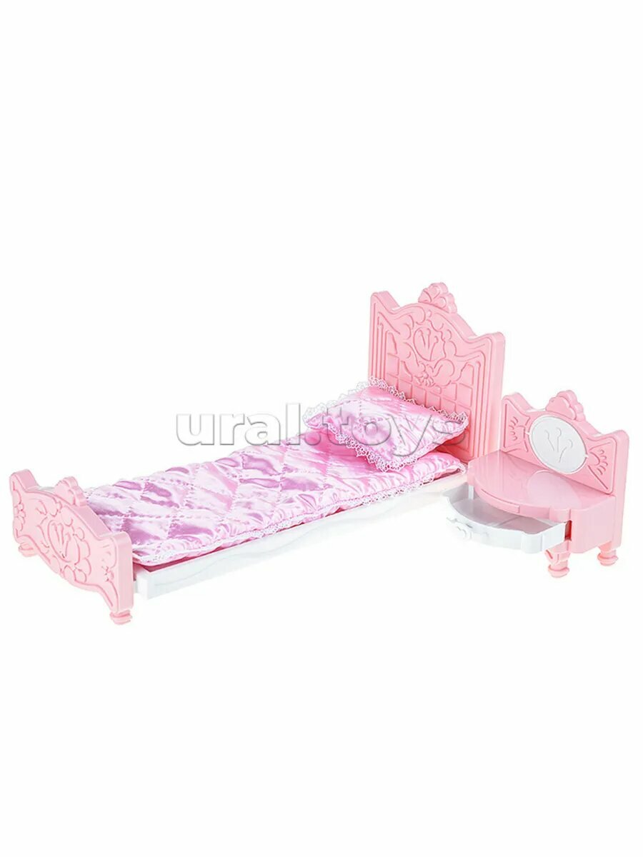 Изготовлена из АБС пластика, прочная, глянцевая поверхность, на кровати одеяло и подушка из розового атласа с кантом из кружева, подходит для кукол типа Барби, Синди и т.п.