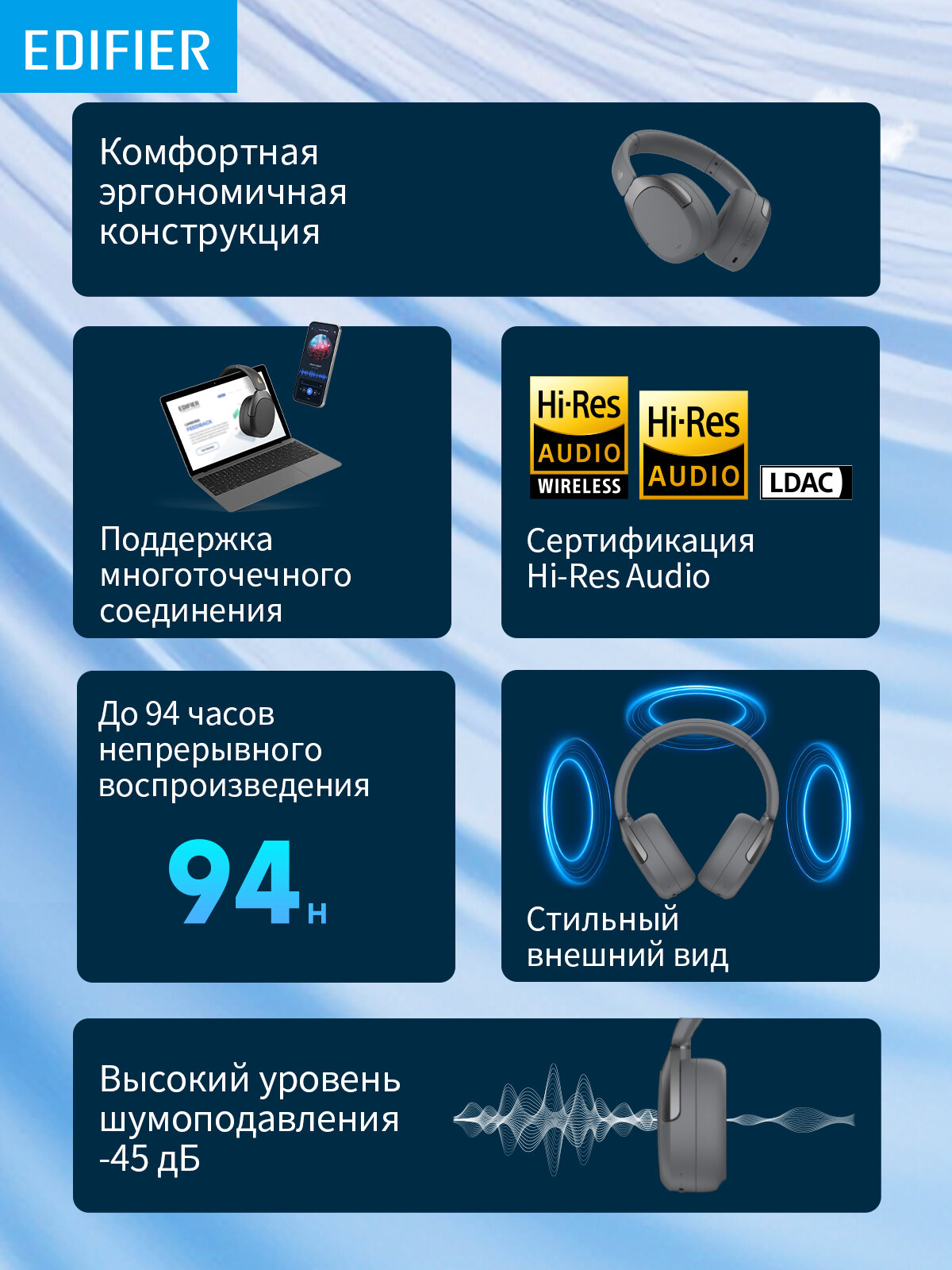 Описание: Беспроводные полноразмерные наушники с активным шумоподавлением. Улучшенный эргономичный дизайн, обеспечивающий комфортное ношение в течение всего дня. Поддержка многоточечного соединения, позволяющая мгновенно переключаться между музыкой, видео и звонками на двух разных устройствах одновременно.