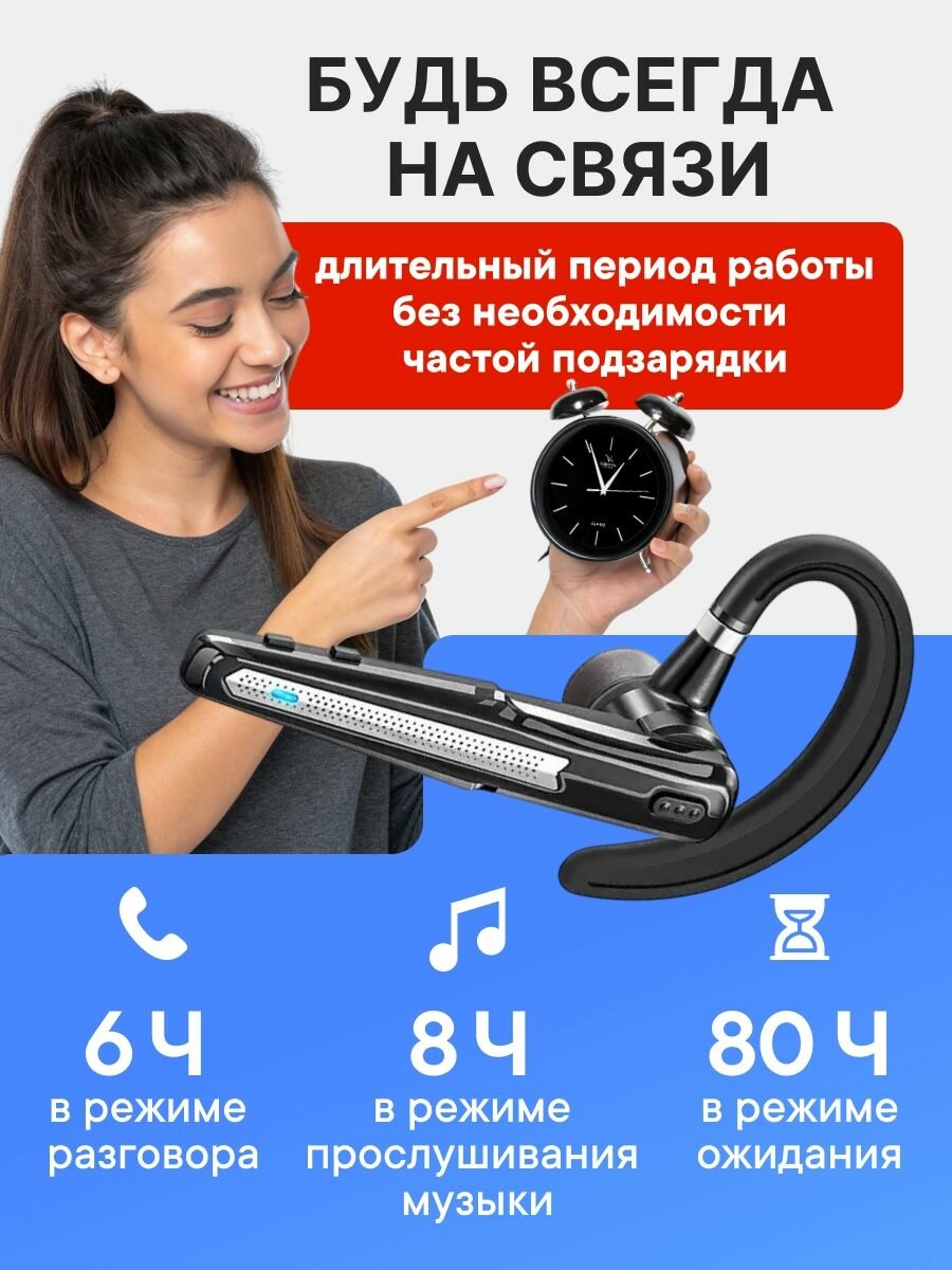 Время работы в режиме разговора 8 часов. Время работы в режиме ожидания 120часов. Время работы в режиме прослушивания музыки 24 часа. Версия Bluetooth: 5.0. Расстояние до телефона: 12-15 метров.