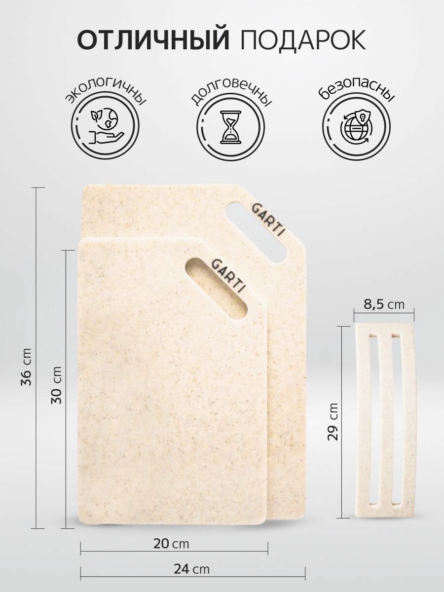 В целом, набор разделочных досок от GARTI — это идеальное решение для тех, кто ценит качество, стиль и функциональность. Он станет незаменимым помощником на кухне и будет радовать вас своей надежностью и долговечностью на протяжении многих лет.