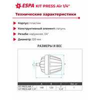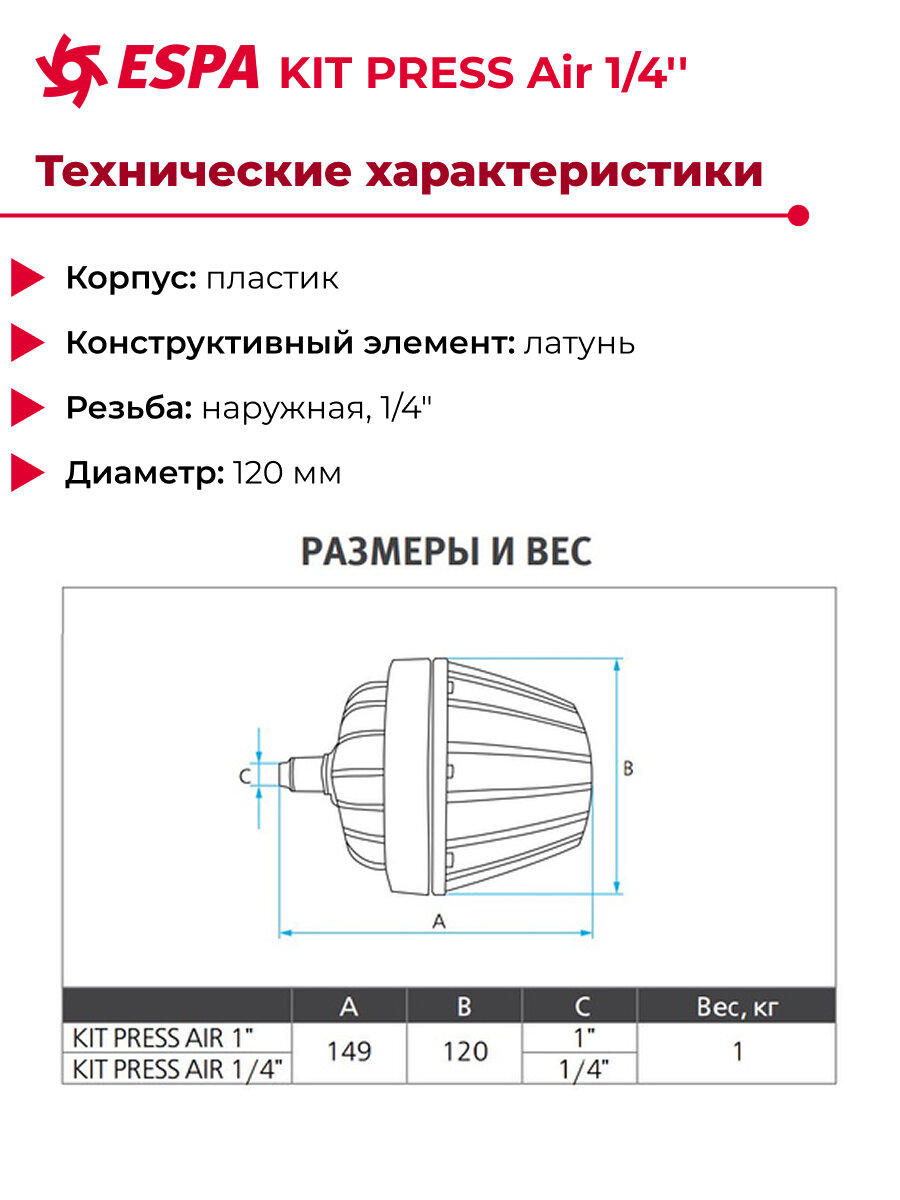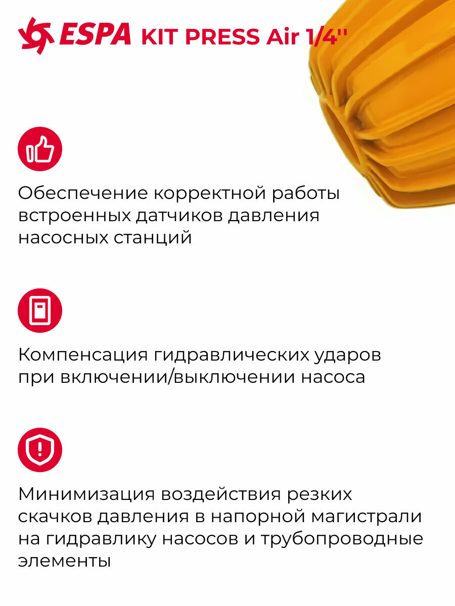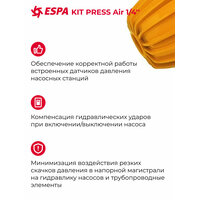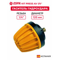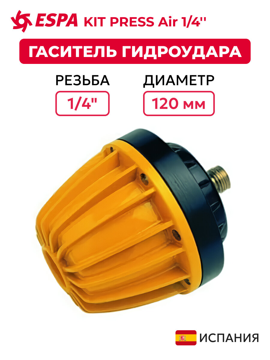 Наружная резьба 1/4", диаметр 120 мм Гасители гидроударов Espa Kit Press Air 1/4? предназначены для минимизации воздействия резких скачков давления в напорной магистрали на гидравлику насосов и трубопроводные элементы, а также для обеспечения корректной работы встроенных датчиков давления насосных станций и блоков контроля потока. Устройство представляет собой подпружиненный герметичный поршень, способный перемещаться под действием давления воды, размещенный в компактном корпусе асферической формы. Корпус гасителя гидроударов выполнен из пластика, конструктивный элемент - из латуни.