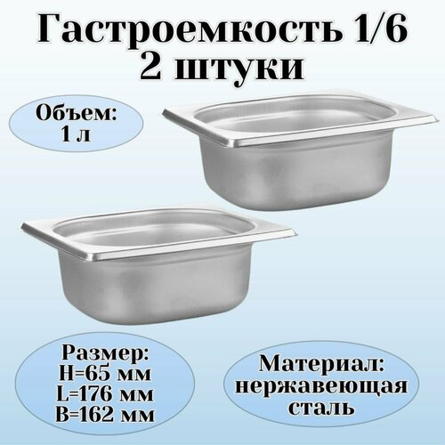 В комплекте 2 штуки. Цвет: хромированный. Материал: нержавеющая сталь. Размер: 1/6 (H=65 мм, L=176 мм, B=162 мм). Объем: 1 литр.