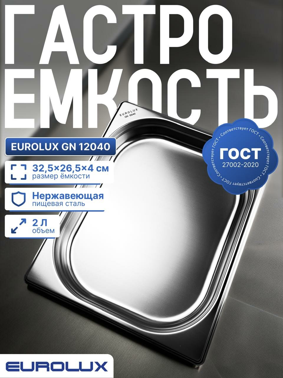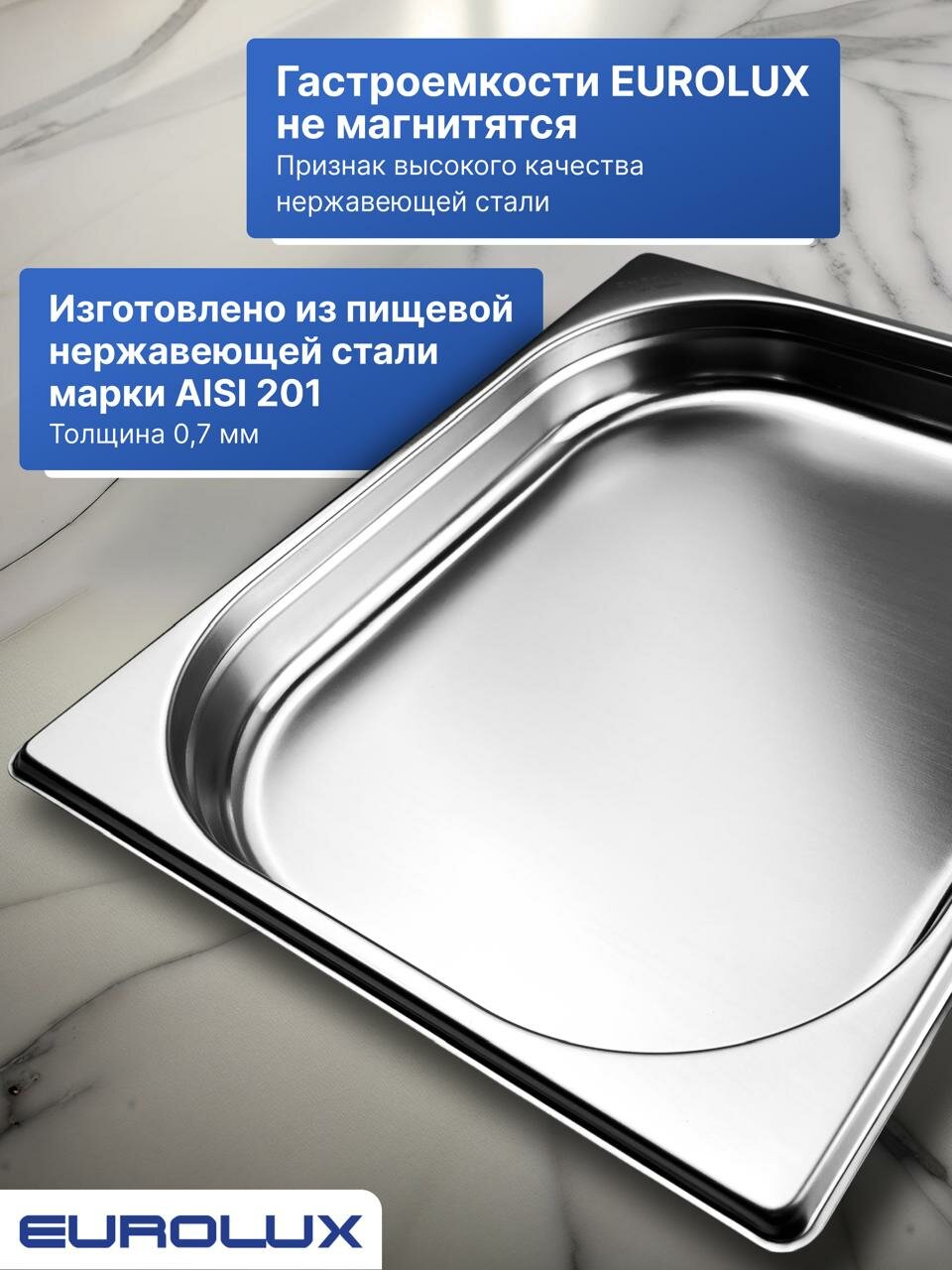 Гастроемкости EUROLUX не магнитятся - это признак высококачественной нержавеющей стали а также не имеет дефектов штамповки и заусенец. Качество соответствует ГОСТ 27002-2020 изготовлена из пищевой нержавеющей стали марки AISI 201 толщиной 0,7 мм. Гастроемкости EUROLUX не магнитятся - это признак высококачественной нержавеющей стали а также не имеет дефектов штамповки и заусенец. Качество соответствует ГОСТ 27002-2020 изготовлена из пищевой нержавеющей стали марки AISI 201 толщиной 0,7 мм. Гастроемкости EUROLUX не магнитятся - это признак высококачественной нержавеющей стали а также не имеет дефектов штамповки и заусенец. Качество соответствует ГОСТ 27002-2020 изготовлена из пищевой нержавеющей стали марки AISI 201 толщиной 0,7 мм.