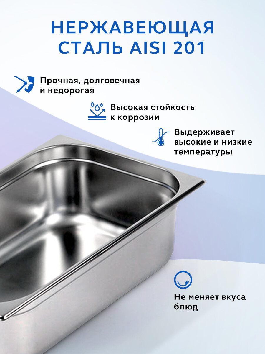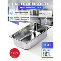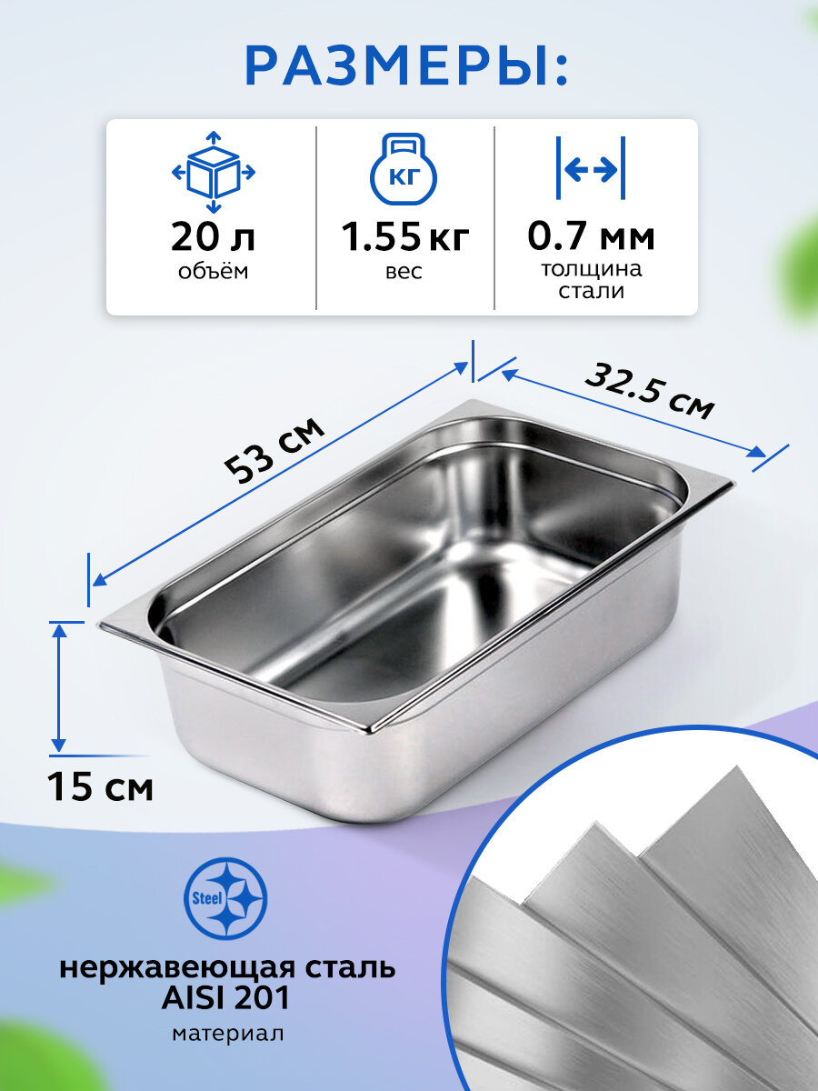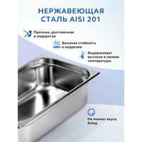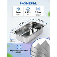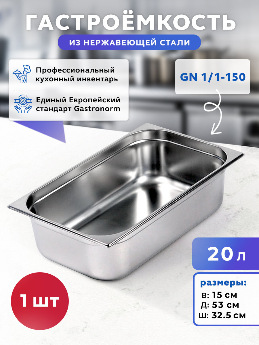 Гастроемкость из нержавеющей стали Gastrorag GN 1/1-150, модель 11150, размеры 53х32,5х15 см, объем 20 л. Гастрономические емкости из нержавеющей стали – это удобный и многофункциональный кухонный инвентарь. Изначально он предназначался для профессиональной кухни и использовался для приготовления, хранения, транспортировки, подачи пищи, сервировки и выкладки продуктов на пищевых производствах, предприятиях общепита, в супермаркетах. Особенность этого вида посуды для кухни в том, что его размеры соответствуют единому европейскому стандарту гастрономической тары. За основу берется размер GN 1/1 (53х32.5 см), существуют также кратный размер GN 2/1 (65х53 см) и дробные размеры GN 2/3 (35.4х32.5 см), GN 1/2 (32.5х26.5 см), GN 1/3 (32.5х17.6 см), GN 1/4 (26.5х16.2 см), GN 1/6 (17.6х16.2 см), GN 1/9 (17.6х10.8 см). Глубина лотков также стандартизирована и составляет 2, 4, 6.5, 10, 15 и 20 см. Со временем гастроемкости из нержавейки стали незаменимыми помощниками и на домашней кухне. Вы можете использовать их для приготовления и хранения блюд, маринования шашлыка, расстойки теста. Прямоугольные лоточки позволяют организовать рациональное хранение в холодильнике и очень удобны в качестве посуды для холодца. Контейнеры большого размера совместно с погружными термостатами подойдут для приготовления блюд методом су вид. Посуда изготовлена из пищевой нержавеющей стали, отличается прочностью, легко выдерживает высокие и низкие температуры, инертна по отношению к пищевым продуктам – не меняет вкуса блюд, которые в ней готовятся и хранятся, не нуждается в специальном уходе. Ее можно мыть в посудомоечной машине. А благодаря стандартным размерам и форме лотки компактно складируются и не занимают много места при хранении. Гастроемкости Gastrorag могут быть также укомплектованы крышками из нержавеющей стали.