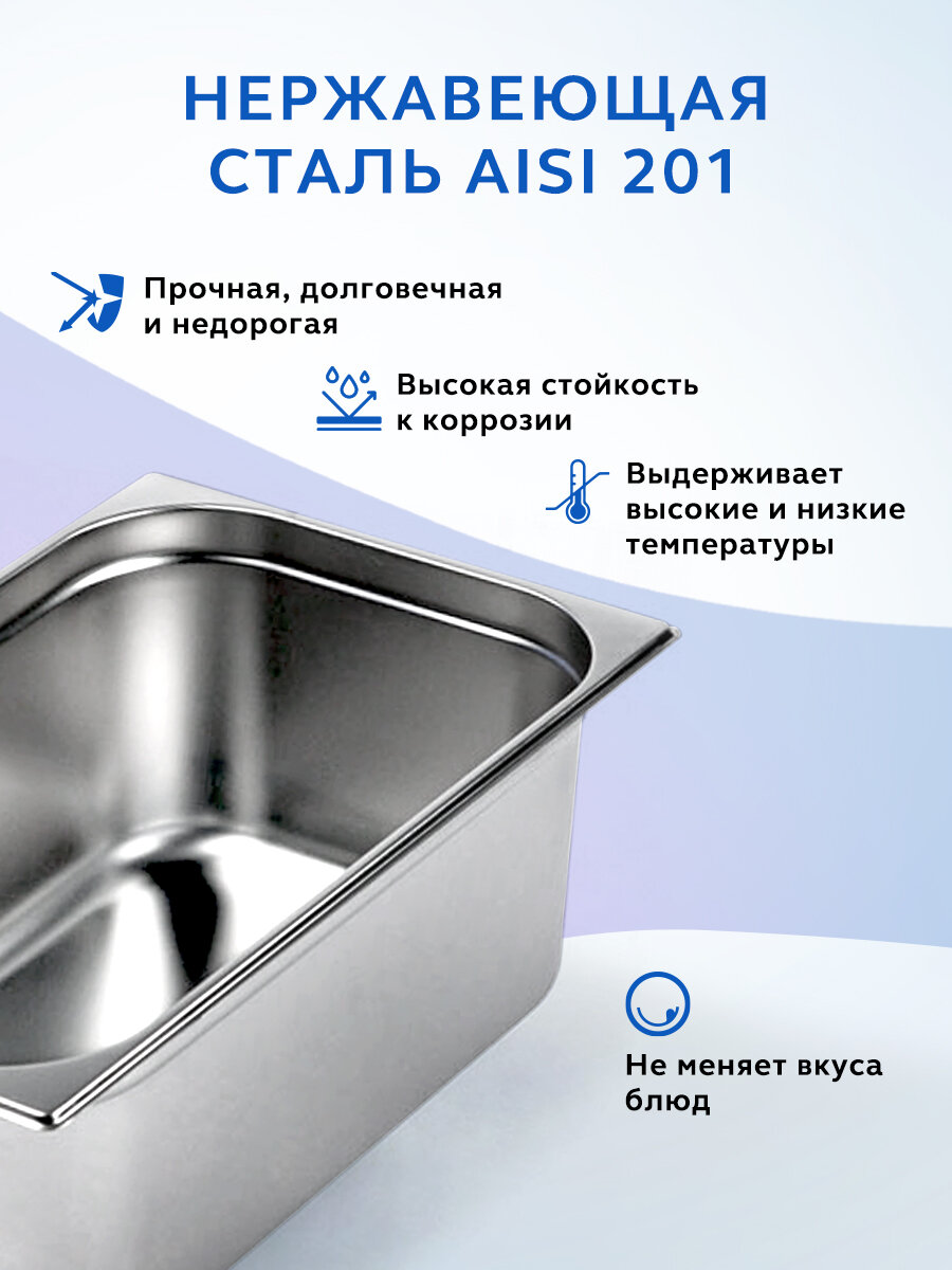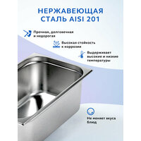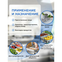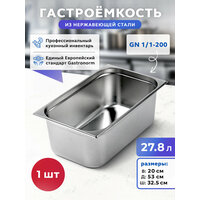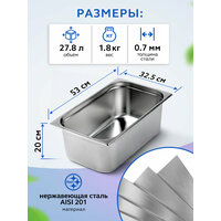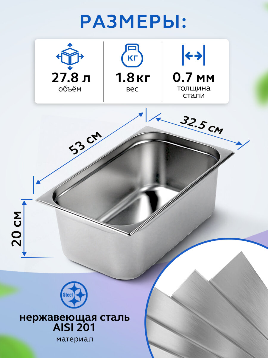 Гастроемкость из нержавеющей стали Gastrorag GN 1/1-200, модель 11200, размеры 53х32,5х20 см, объем 27.8 л. Гастрономические емкости из нержавеющей стали – это удобный и многофункциональный кухонный инвентарь. Изначально он предназначался для профессиональной кухни и использовался для приготовления, хранения, транспортировки, подачи пищи, сервировки и выкладки продуктов на пищевых производствах, предприятиях общепита, в супермаркетах. Особенность этого вида посуды для кухни в том, что его размеры соответствуют единому европейскому стандарту гастрономической тары. За основу берется размер GN 1/1 (53х32.5 см), существуют также кратный размер GN 2/1 (65х53 см) и дробные размеры GN 2/3 (35.4х32.5 см), GN 1/2 (32.5х26.5 см), GN 1/3 (32.5х17.6 см), GN 1/4 (26.5х16.2 см), GN 1/6 (17.6х16.2 см), GN 1/9 (17.6х10.8 см). Глубина лотков также стандартизирована и составляет 2, 4, 6.5, 10, 15 и 20 см. Со временем гастроемкости из нержавейки стали незаменимыми помощниками и на домашней кухне. Вы можете использовать их для приготовления и хранения блюд, маринования шашлыка, расстойки теста. Прямоугольные лоточки позволяют организовать рациональное хранение в холодильнике и очень удобны в качестве посуды для холодца. Контейнеры большого размера совместно с погружными термостатами подойдут для приготовления блюд методом су вид. Посуда изготовлена из пищевой нержавеющей стали, отличается прочностью, легко выдерживает высокие и низкие температуры, инертна по отношению к пищевым продуктам – не меняет вкуса блюд, которые в ней готовятся и хранятся, не нуждается в специальном уходе. Ее можно мыть в посудомоечной машине. А благодаря стандартным размерам и форме лотки компактно складируются и не занимают много места при хранении. Гастроемкости Gastrorag могут быть также укомплектованы крышками из нержавеющей стали.
