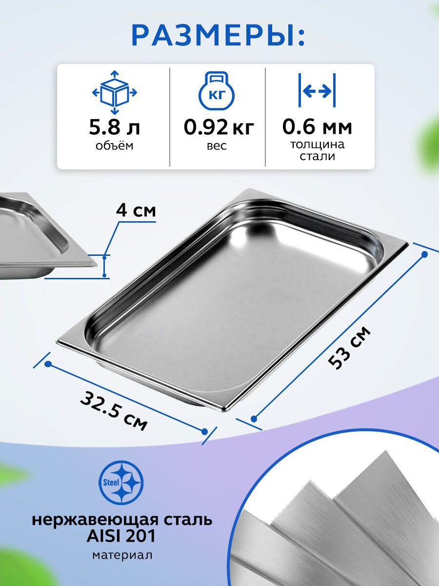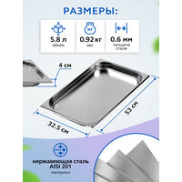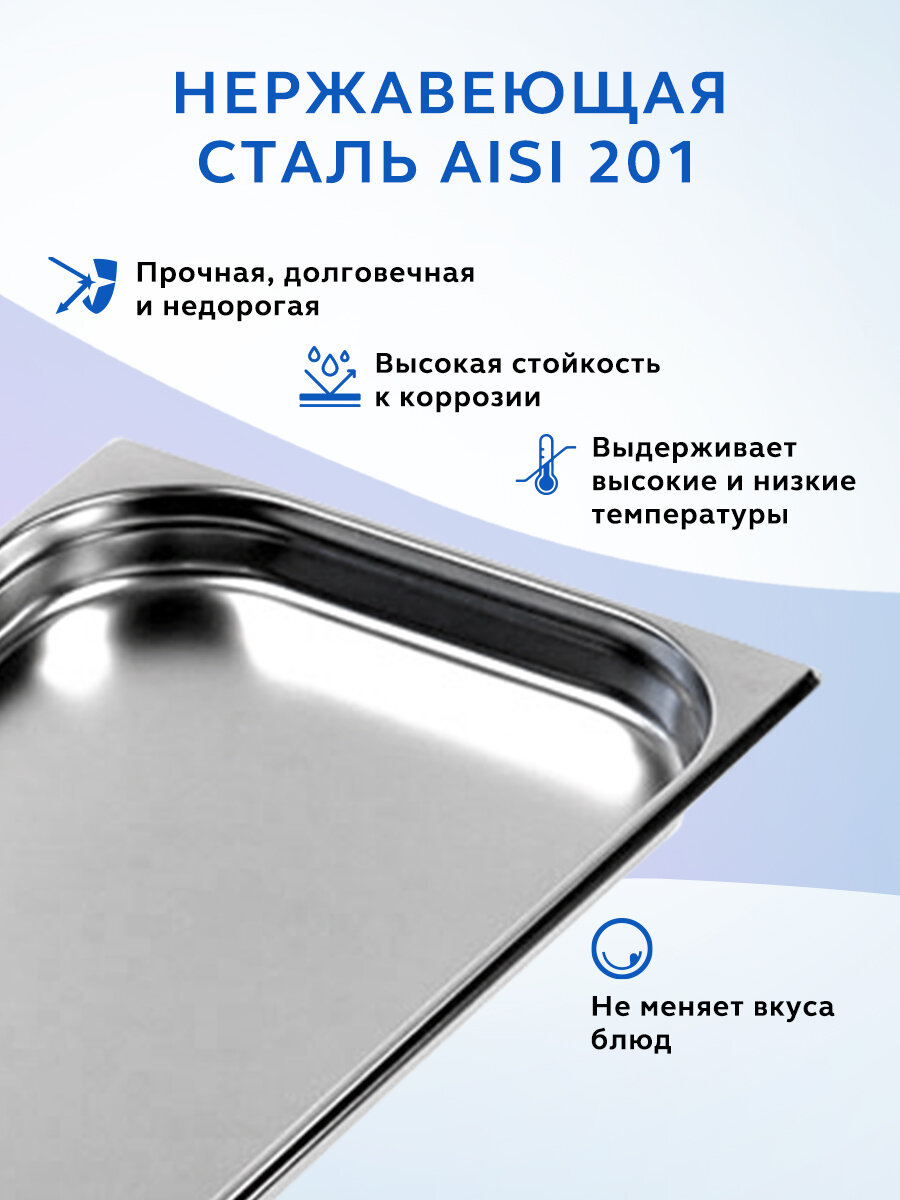 Гастроемкость перфорированная из нержавеющей стали Gastrorag GN 1/1-40, модель FF11040, размеры 53х32,5х4 см. Гастрономические емкости из нержавеющей стали – это удобный и многофункциональный кухонный инвентарь. Изначально он предназначался для профессиональной кухни и использовался для приготовления, хранения, транспортировки, подачи пищи, сервировки и выкладки продуктов на пищевых производствах, предприятиях общепита, в супермаркетах. Особенность этого вида посуды для кухни в том, что его размеры соответствуют единому европейскому стандарту гастрономической тары. За основу берется размер GN 1/1 (53х32.5 см), существуют также кратный размер GN 2/1 (65х53 см) и дробные размеры GN 2/3 (35.4х32.5 см), GN 1/2 (32.5х26.5 см), GN 1/3 (32.5х17.6 см), GN 1/4 (26.5х16.2 см), GN 1/6 (17.6х16.2 см), GN 1/9 (17.6х10.8 см). Глубина лотков также стандартизирована и составляет 2, 4, 6.5, 10, 15 и 20 см. Со временем гастроемкости из нержавейки стали незаменимыми помощниками и на домашней кухне. Вы можете использовать их для приготовления и хранения блюд, маринования шашлыка, расстойки теста. Прямоугольные лоточки позволяют организовать рациональное хранение в холодильнике и очень удобны в качестве посуды для холодца. Контейнеры большого размера совместно с погружными термостатами подойдут для приготовления блюд методом су вид. Посуда изготовлена из пищевой нержавеющей стали, отличается прочностью, легко выдерживает высокие и низкие температуры, инертна по отношению к пищевым продуктам – не меняет вкуса блюд, которые в ней готовятся и хранятся, не нуждается в специальном уходе. Ее можно мыть в посудомоечной машине. А благодаря стандартным размерам и форме лотки компактно складируются и не занимают много места при хранении. Перфорированные гастроемкости предназначены для выпечки, бланширования, приготовления на пару, процеживания, сушки. Перфорация нанесена на дно емкости, обеспечивает циркуляцию воздуха и позволяет стекать излишней жидкости.