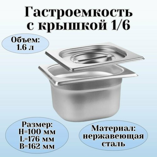 Размер гастроемкости: 1/6 (H=100 мм, L=176 мм, B=162 мм).