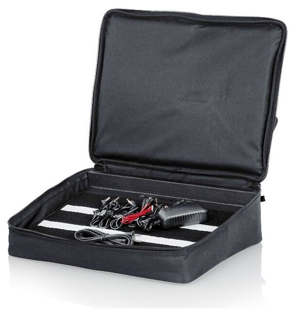 GATOR GPT - универсальная доска для установки гитарных педалей эффектов. Закрепленные на GPT с габаритными размерами 16.5х12 дюймов педали подключаются в нужной последовательности и в таком уже рабочем состоянии подлежат транспортировке и оказываются готовыми к использованию на мероприятии. Прочное основание изготовлено из фанеры и покрыто отделкой Tolex. В педалборде предусмотрены отверстия для кабелей и крепления источника питания (БП приобретается отдельно). Аксессуар комплектуется пошитой из черного нейлона сумкой с ручкой, для удобной переноски. Внутренние размеры: 41,91 х 30,48 х 6,35 см. Сбоку сумки находится вместительный внешний карман на молнии, который предназначен для хранения шнуров и небольших аксессуаров.