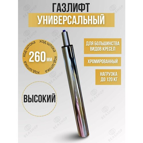 Супервысокий газлифт (газпатрон) для барных стульев, кресел, а также для стульев мастеров, тату-мастеров и т. д. Диаметр стакана газлифта: 50 мм. Длина стакана 380 мм. Длина газлифта в сжатом состоянии - 460 мм, длина газлифта в разжатом состоянии - 710 мм. Ход штока газлифта: 260 мм. Допустимая нагрузка на высокий газлифт до 120 кг.