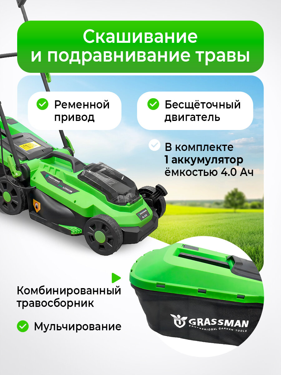 | Дополнительные функции | регулировка высоты скашивания, функция мульчирования |
