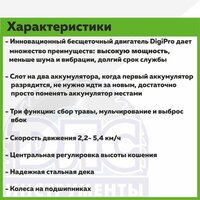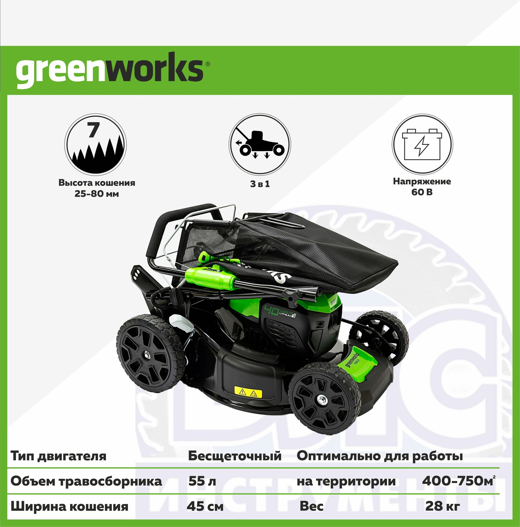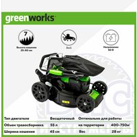Аккумуляторная газонокосилка Greenworks GD40LM46SP — это мощная, универсальная и практичная самоходная газонокосилка мощностью 40V. Она имеет переменную скорость, предназначенную для увеличения мощности и комфортной работы пользователя в выполнении сложных задач. Газонокосилка имеет передовой бесщёточный двигатель, который резко снижает вибрации и требует минимального обслуживания. GD40LM46SP имеет ширину скашивания 46 см — достаточно большую, чтобы обработать площадь до 800 м2 на одной зарядке благодаря двум слотам для батареек и достаточно маленькую, чтобы хранить на складе с другими инструментами. Данная модель оснащена функцией 3-в-1: мульчирование, задний сбор травы и боковой выброс. Травосборник имеет объём 55 литров, что дает Вам больше времени для кошения и сокращает время на высвобождение контейнера от травы. Благодаря семи различным режимам кошения приятно работать даже в самом сложном саду.