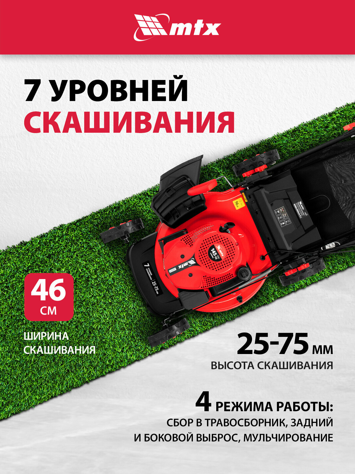 Бензиновая газонокосилка MTX GL46SP-K 58837 с двигателем объемом 145 см³, приводом на колеса и травосборником объемом 50 л обеспечивает ширину скашивания 46 см. Предназначена для кошения травы на газонах и лужайках, оптимальна для ухода за приусадебным участком небольшой площади. Высота скашивания регулируется в диапазоне 25-75 мм (предусмотрено 7 уровней) — можно привести в порядок спортивную площадку, лужайку для отдыха и т. д. Четырехтактный двигатель мощностью 3,5 л. с. позволяет эффективно решать поставленные задачи.