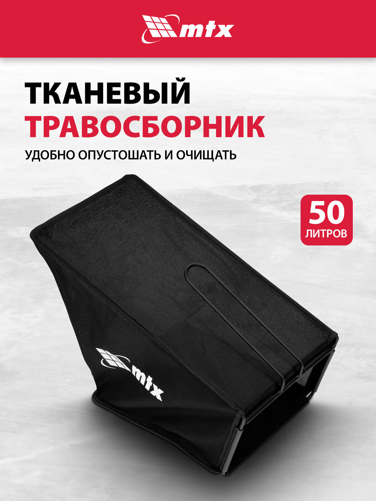 - Удобная эксплуатация и хранение — усиленная конструкция рукоятки позволяет комфортно управлять газонокосилкой, тканевый травосборник не утяжеляет конструкцию, а в сложенном состоянии не занимает много места.
