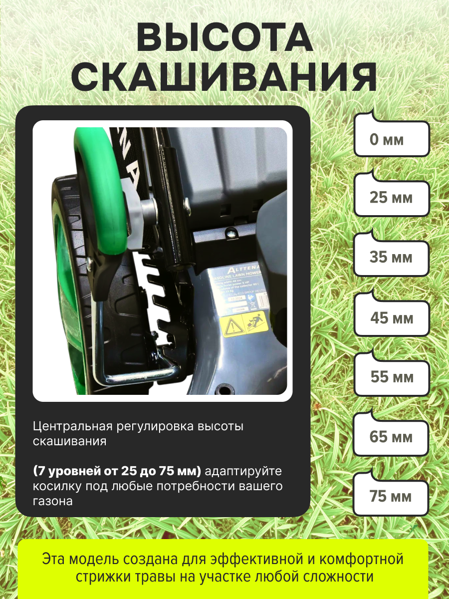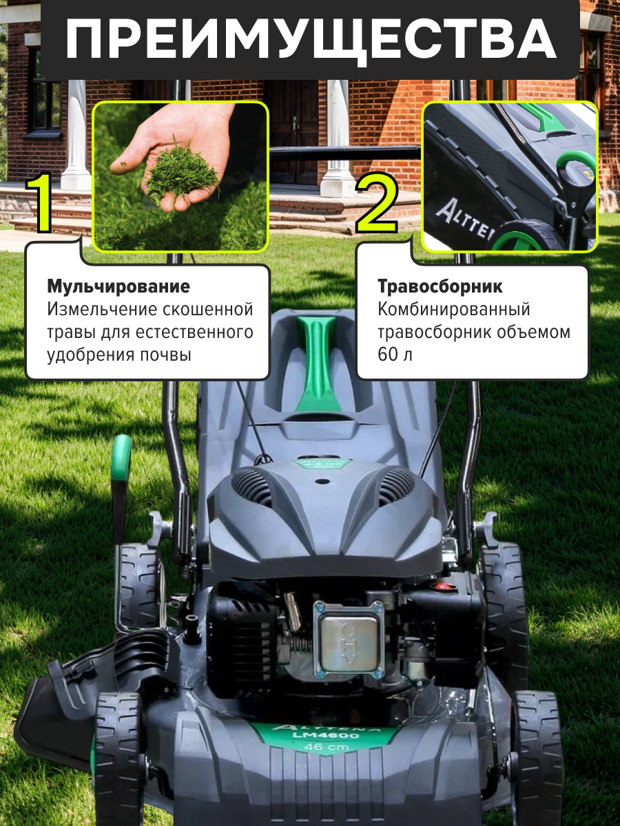 Бензиновая газонокосилка ALTTENA 4600 станет надежным помощником для каждого владельца загородного дома или дачи. Не упустите возможность сделать свой газон ухоженным и красивым с помощью этого качественного инструмента! Выбирайте ALTTENA 4600 и наслаждайтесь легкостью в уходе за вашим садом.