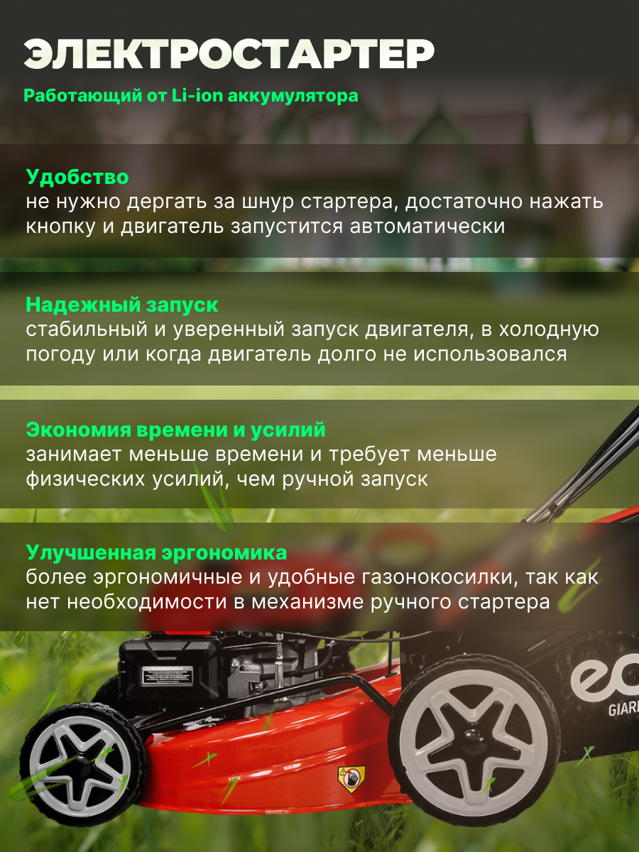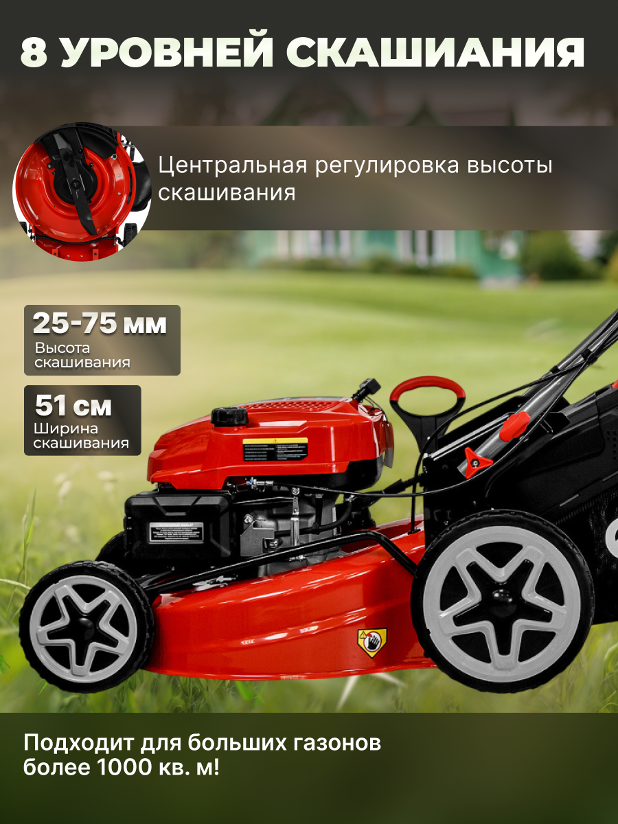 | Дополнительные функции | возможность промывки деки, регулировка высоты скашивания, функция мульчирования, электростартер |