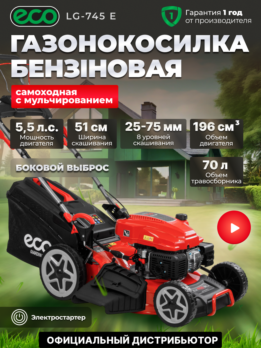 Газонокосилка бензиновая самоходная ECO LG-745 E с мульчированием и травосборником (EC2014-7): сравнение цен, характеристики, фото, актуальное наличие и цены.