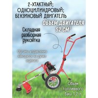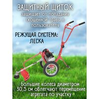 Бензиновая газонокосилка применяется для скашивания травы в саду или на частном участке. Удобная система управления. Все переключатели находятся на ручке агрегата для удобства оператора. Складная разборная рукоятка газонокосилки обеспечивает компактное хранение и транспортировку. В нижней части предусмотрен щиток, который защищает от попадания скошенной травы в пользователя. Щиток защищает пользователя от летящей во время скашивания травы. Большие колеса диаметром 30,5см облегчают перемещение агрегата по участку. У триммера на колесах предусмотрены рукоятки с обрезиненным покрытием для крепкого хвата во время работы.