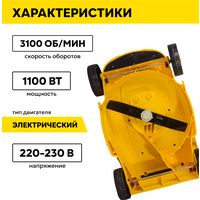 Газонокосилка оснащена электрическим двигателем мощностью 1100 Вт, который обеспечивает высокую производительность и экономичность. Обороты двигателя составляют 3200 об/мин, что гарантирует быстрое и качественное скашивание травы.