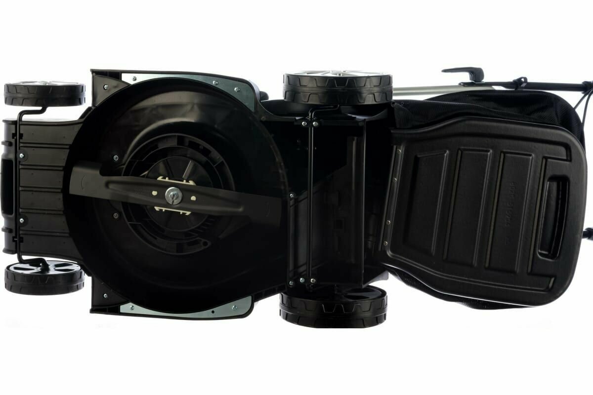 - Травосборник, рассчитанный на 45 л отходов, не требует частого опустошения. Также контейнер оснащен индикатором наполнения.