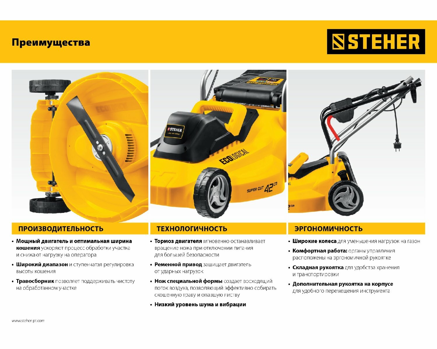 | Дополнительная информация | легкая конструкция, современный дизайн, эргономичная рукоятка, специальная форма ножа, мгновенный тормоз двигателя, органы управления на рукоятке, австрийское качество, защита от случайного запуска, система безопасности при потере контроля, подъем полегшей травы, сбор опавшей листвы, экономичное энергопотребление, низкий уровень шума, минимальная вибрация, экологичность, простота обслуживания, маневренность, устойчивые колеса, компактное хранение |