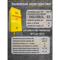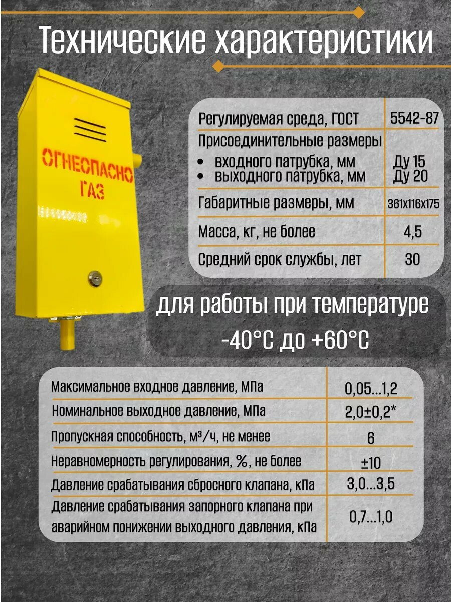 Природный газ по ГОСТ 5542-87, максимальное входное давление 0,05.1,2 МПа, пропускная способность не менее 6 м3/ч, неравномерность регулирования не более +/- 10%, давление срабатывания сбросного клапана 3,0.3,5 кПа, давление срабатывания запорного клапана при аварийном понижении выходного давления 0,7.1,0 кПа.