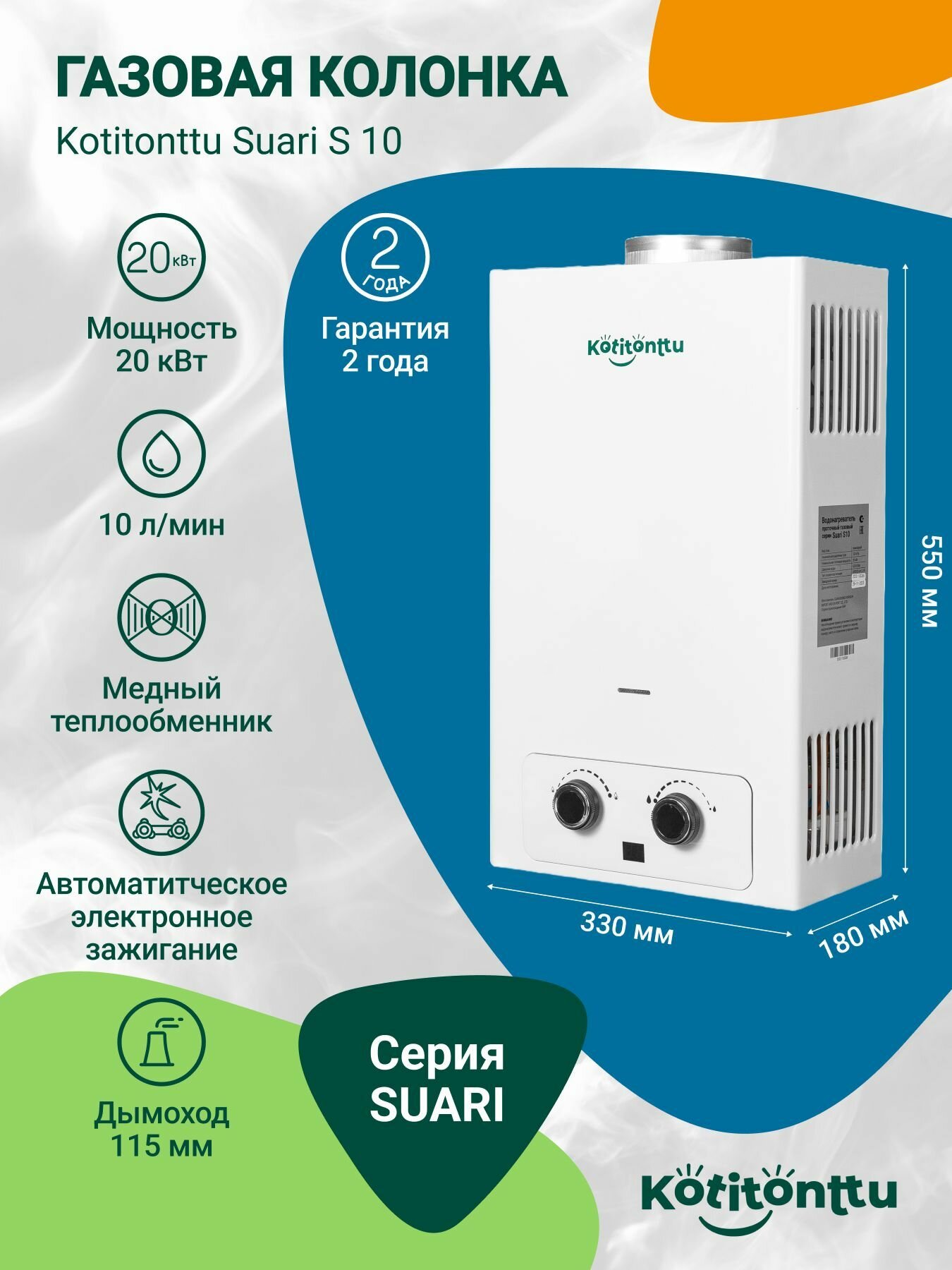 Купить Газовая колонка Kotitonttu Suari S10 с доставкой по всей России. Газовая колонка Kotitonttu Suari S10: сравнение цен, характеристики, фото, актуальное наличие и цены.
