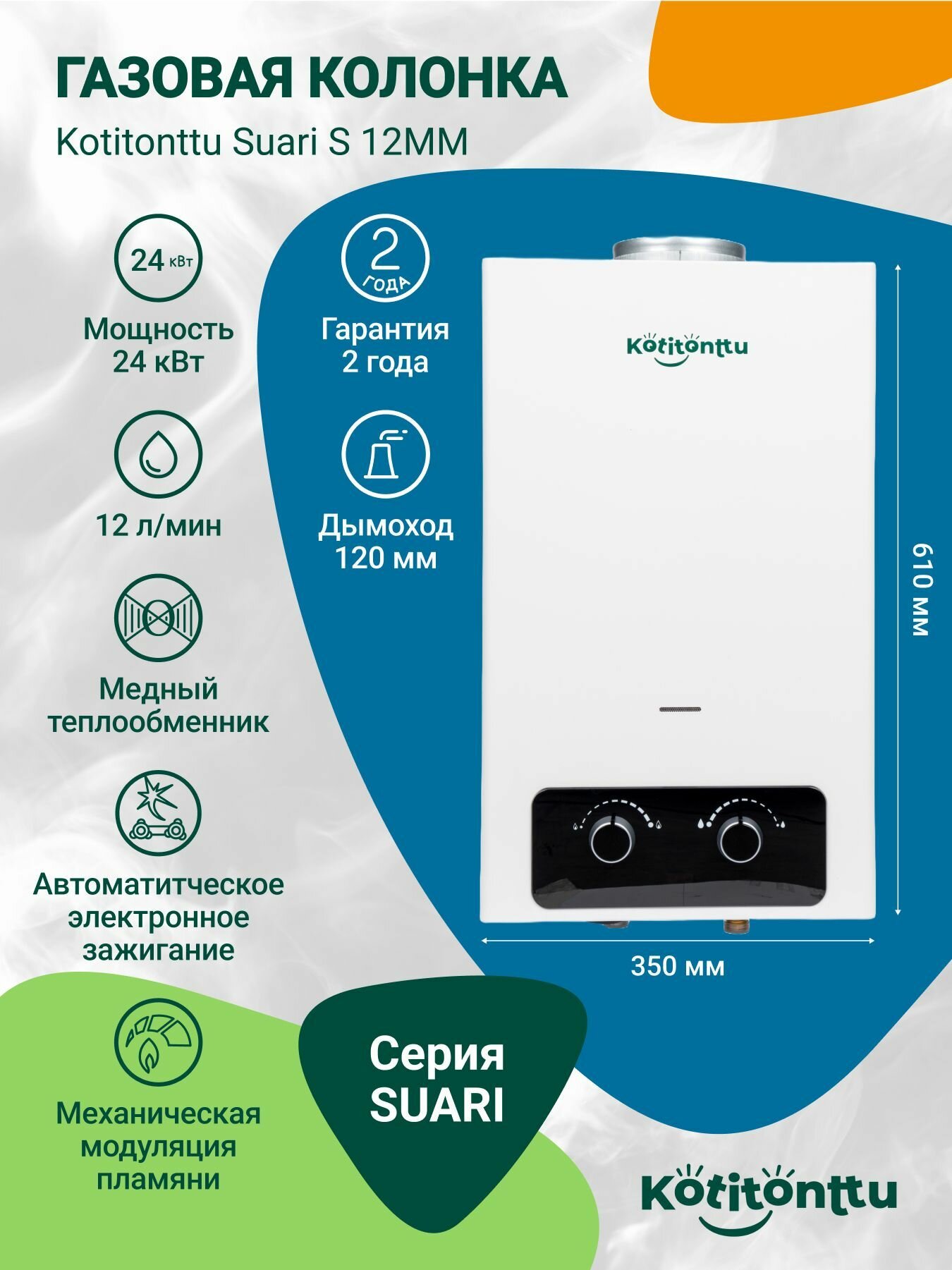 Купить Газовая колонка Kotitonttu Suari S12MM с доставкой по всей России. Газовая колонка Kotitonttu Suari S12MM: сравнение цен, характеристики, фото, актуальное наличие и цены.