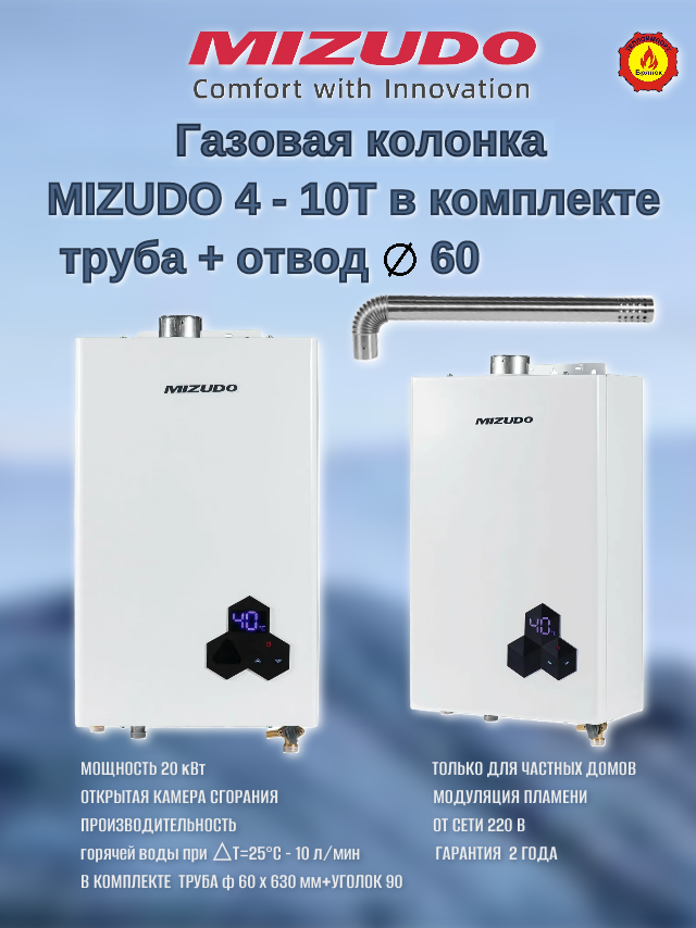 Газовая колонка Mizudo ВПГ 4-10T турбированная с открытой камерой сгорания, турбированная колонка Мизудо 4-10Т с трубой дымоудаления в комплекте: сравнение цен, характеристики, фото, актуальное наличие и цены.