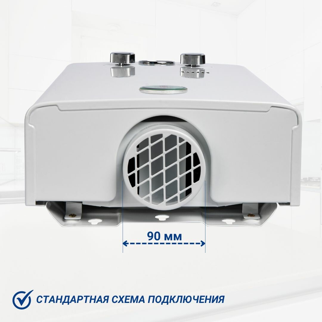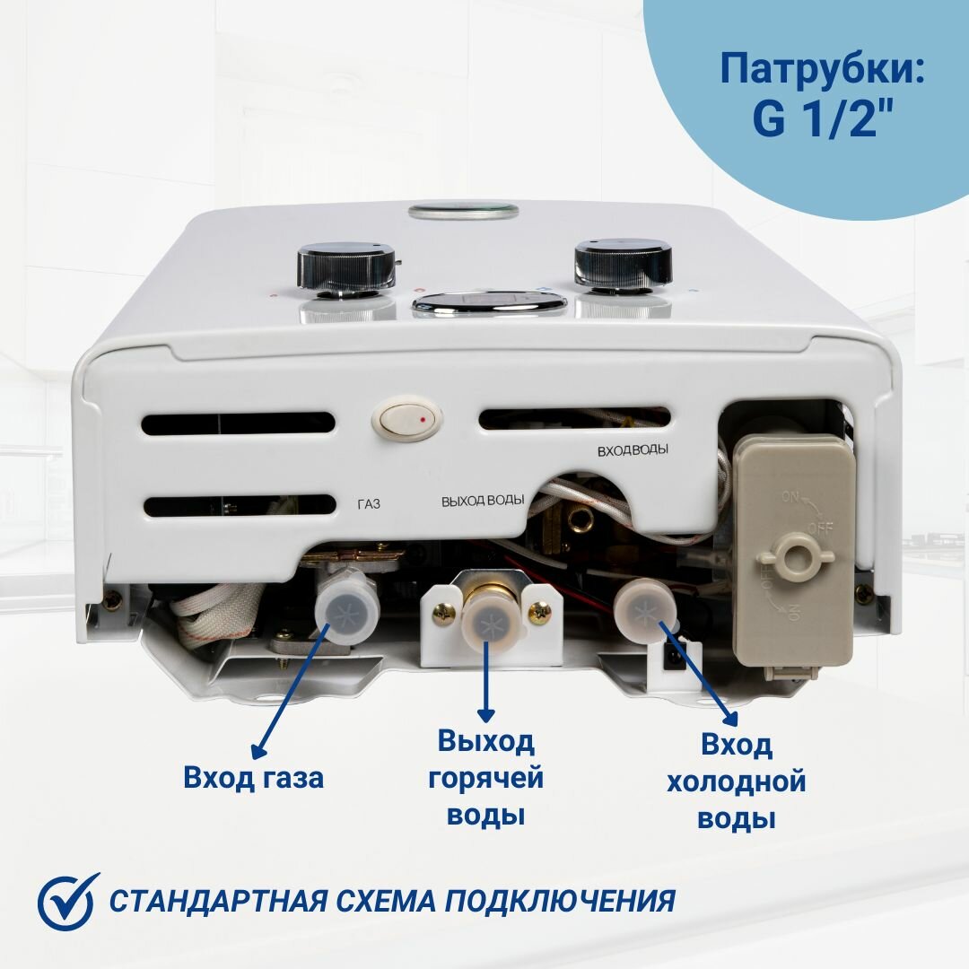 Подключается по стандартной схеме: - Присоединительные размеры патрубков для газа, холодной и горячей воды — G 1/2". - Присоединительный диаметр дымохода — 90 мм.