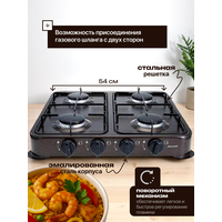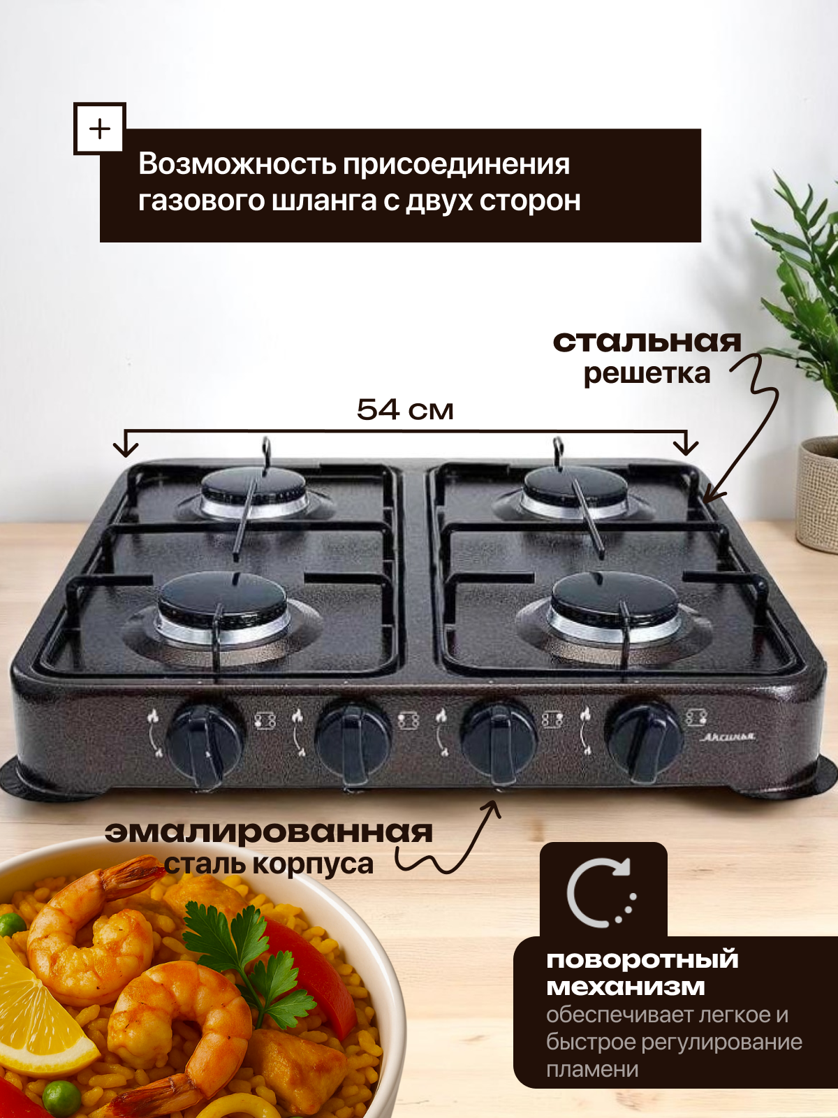 | Дополнительная информация | номинальная тепловая мощность конфорок 2,2×4 кВт; номинальный расход газа 640 г/ч; номинальное давление газа 3000 Па; тип розжига горелки ручной максимальная нагрузка на одну конфорку 10 кг; минимальный/максимальный диаметр дна посуды 120/160 мм; плавная регулировка пламени; возможность присоединения газового шланга с двух сторон; плита отрегулирована для работы на сжиженном газе, использовать только с бытовыми газовыми баллонами (объемом 5 л; 12 л; 27 л или 50 л); подсоединение газовой плиты к газовому баллону должно осуществляться при помощи регулятора давления газа (редуктора), резинового шланга и хомута; запрещено подключать баллон с газом напрямую к плите без регулятора давления газа (редуктора); газовый шланг, регулятор давления газа (редуктор) и баллон в комплект поставки не входят |