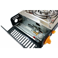 Помимо всего прочего - сочетает в себе возможность работы как от одноразового (цангового) газового баллона, который размещается внутри плиты для каждой конфорки отдельно, так и от бытового баллона объёмом 5-50 литров, который подсоединяется к плите шлангом.