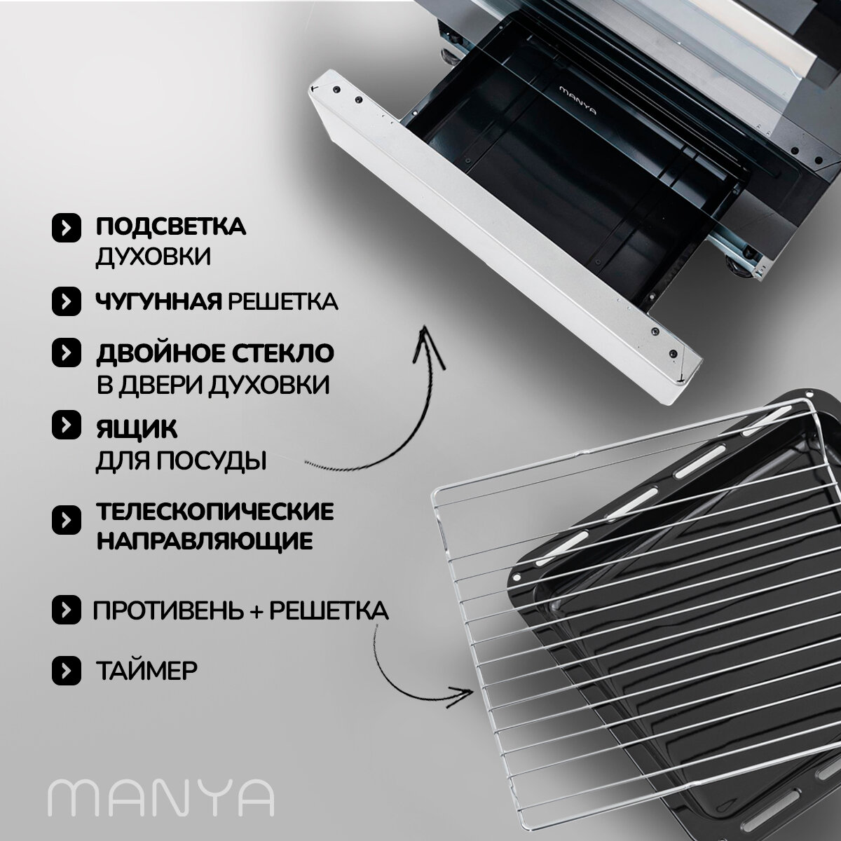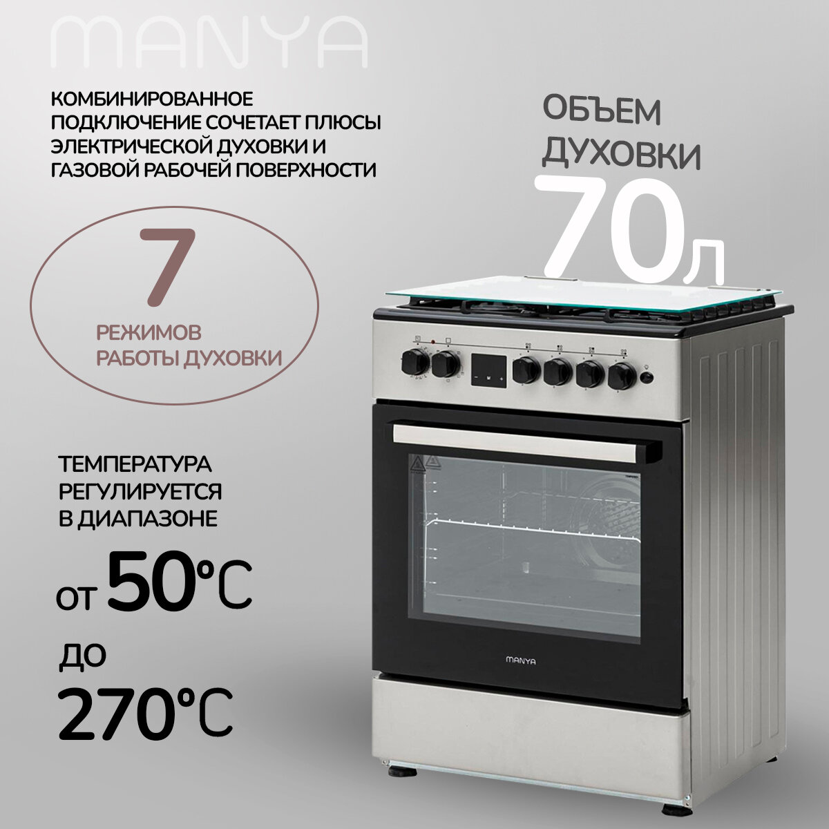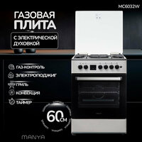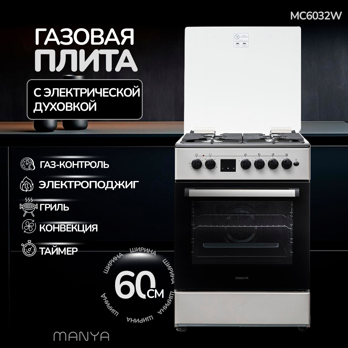 Газовая плита с электрической духовкой 60 см комбинированная MANYA MC6032S каталитическая очистка, чугунные решетки: сравнение цен, характеристики, фото, актуальное наличие и цены.