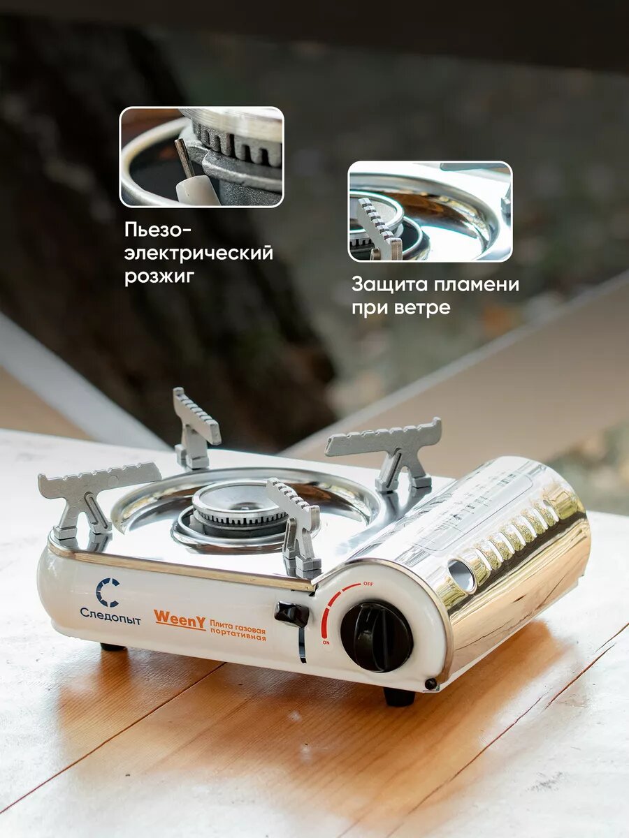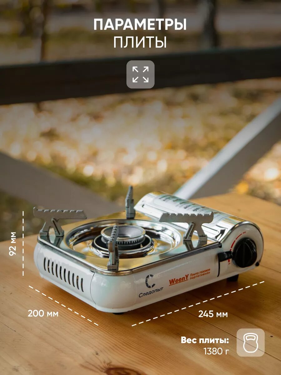 Плита настольная газовая следопыт - предназначена для приготовления пищи как в домашних условиях, так и открытом воздухе. Плита оборудована одной горелкой с кольцевым образованием пламени, имеет пьезоэлектрический розжиг и блок управления подачи газа. Для удобства транспортировки и хранения плита размещается в пластиковом кейсе. В качестве топлива используются газовые смеси в баллонах с нажимным клапаном и цанговым захватом. Подходит для установки на открытых верандах, террасах и беседках. Может использоваться во время туристических походов, кемпинга, охоты и рыбалки.