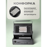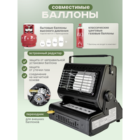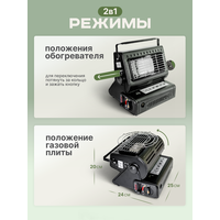 Газовый обогреватель - плита с керамическим нагревательным элементом и пьезоподжигом. Оборудован решеткой (таганком) для казана, металлического чайника, сковородки, кастрюли. Газовая горелка - плитка - это надежное, эффективное и безопасное решение для обогрева палатки на рыбалке, уличных шатров, автотрейлеров, павильонов или небольших помещений дачного типа. Имеет регулировку угла наклона в вертикальное и горизонтальное положения. В силу своей универсальности также может выполнять функции походной кухни для приготовления пищи на природе. Это очень важный момент, так как не требуется брать с собой два предмета, и позволит сэкономить дополнительное место в багажнике автомобиля. Газовая плита туристическая очень проста в обращении, не нуждается в обслуживании и дополнительных настройках. Работает в паре с обычным цанговым баллончиком 220 гр, так и с бытовым баллоном, объемом на 5-50 л с помощью специального переходника, который идет в комплекте с теплообменником. Туристическая плитка имеет: регулятор силы горения; керамический нагнетатель, излучатель; защиту от утечки газа; защита от неправильной установки баллона. Мощность плиты: 1300 Вт - Расход топлива: 100 гр / ч - Тип огня: закрытый. Занимает немного места и весит всего 2 кг. С помощью устройства вы сможете вскипятить воду, приготовить еду, отопить помещение, посушить вещи. Печка походная снабжена клапаном контроля давления газа и устройством настройки защитного картриджа, а также удобной ручкой в верхней части корпуса для переноски. Дополнительный предохранитель самопроизвольной подачи газа и включения пьезоподжига, обеспечит безопасность использования обогревателя. Перед включением пьезоподжига нужно потянуть за кольцо из боковой части корпуса предохранительный рычаг, поджечь газ, затем вернуть предохранительный рычаг в прежнее положение отпустив кольцо.