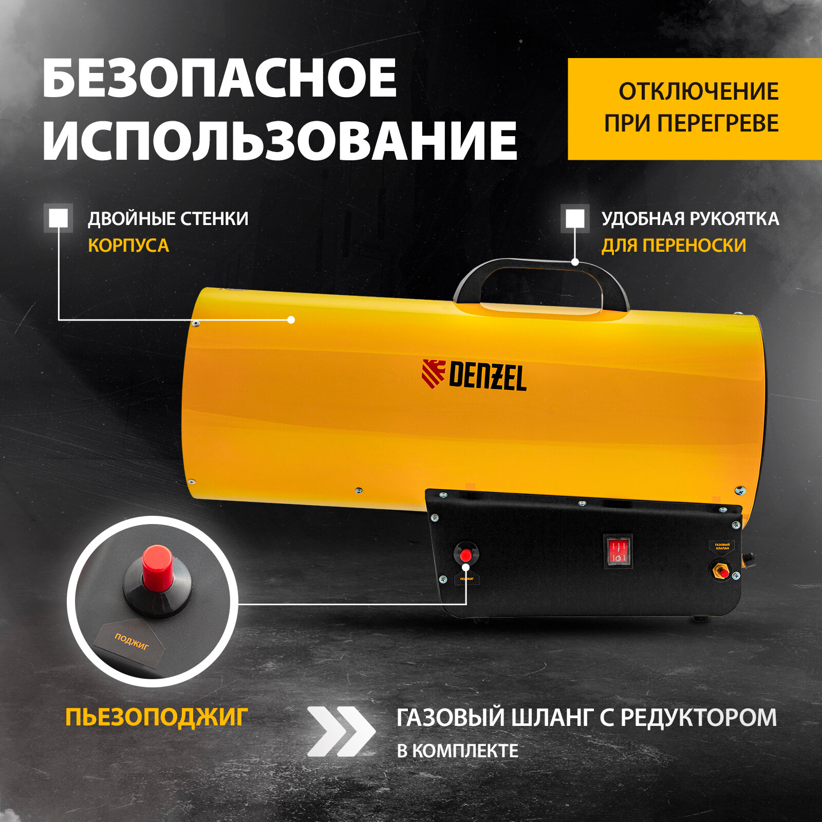 Газовая тепловая пушка Denzel GHG-50 96480 мощностью 50 кВт работает на смеси пропан-бутан и выдает тепловой поток со скоростью 1400 куб. м/ч. Используется для обогрева складов, цехов, гаражей, теплиц и других нежилых помещений площадью до 500 кв. м. Будет полезна на строительных площадках и в производственных помещениях. ПреимуществаПрочность и долговечность — передняя решетка изготовлена из нержавеющей стали, стальной корпус покрыт термостойкой краской для защиты от коррозии. Система безопасности — подача газа и электропитание будут отключены в случае перегрева или при отсутствии пламени. Быстрый старт — для запуска тепловой пушки предусмотрен пьезоподжиг. Экономичность — расход газа составляет 3,3 кг/ч, что позволяет реже менять баллон. Безопасность — выключатель питания закрыт влагозащитным кожухом, задняя решетка предотвращает попадание посторонних предметов и поломку оборудования. Устойчивость — благодаря широкой платформе пушка не опрокидывается во время работы. Готовность к работе — сетевая вилка, газовый шланг и редуктор входят в комплект поставки. Привлекательный внешний вид — выполненная в оригинальном дизайне пушка эффектно смотрится в помещении. Удобная транспортировка — пушка весит 6,8 кг, а на корпусе имеется эргономичная ручка. Гарантия 3 года — качество газовой тепловой пушки подтверждено производителем.